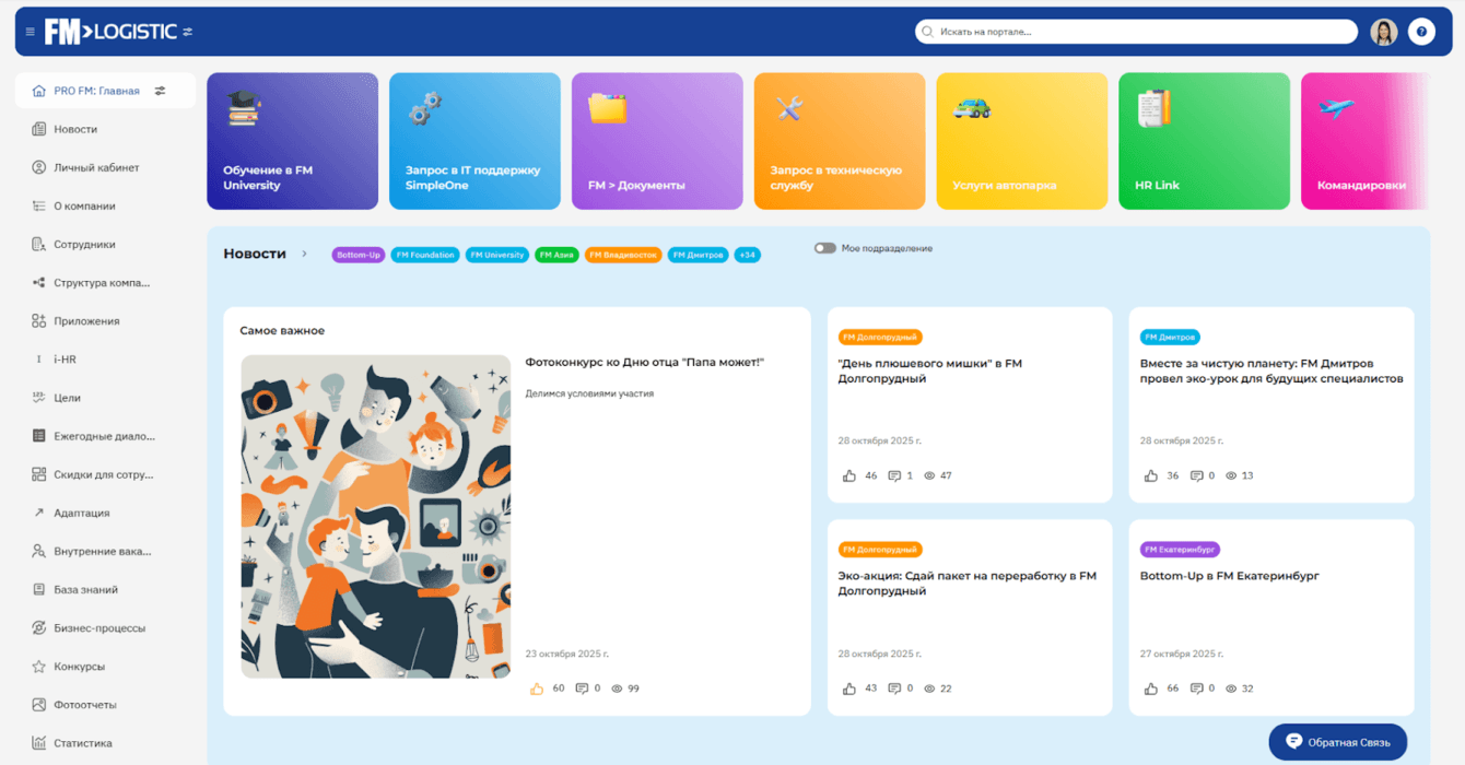 Брендирование портала выполнено в соответствии с корпоративным брендбуком FM Logistic. На главной странице пользователи видят ленту новостей и часто используемые разделы, в которые можно перейти в один клик. Например, пройти опрос, открыть личный кабинет или поздравить коллегу с днем рождения.