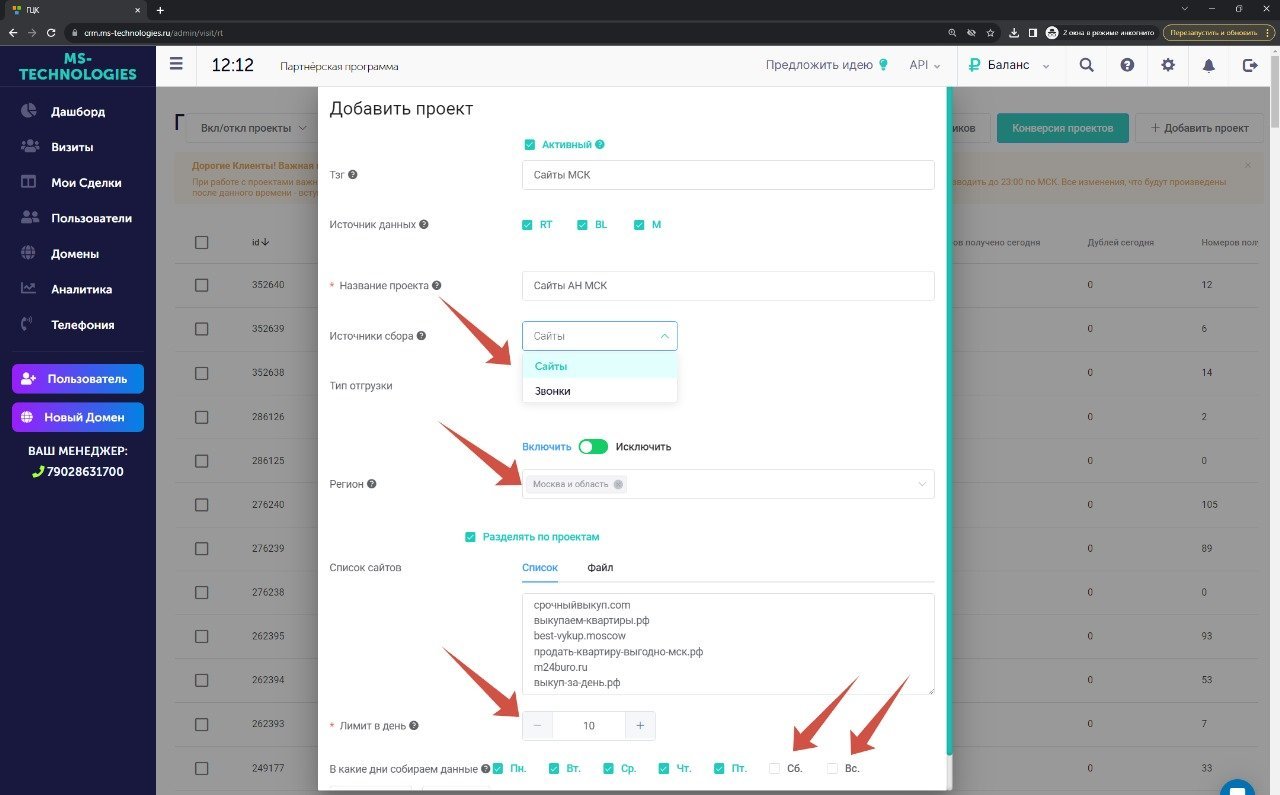 В нашей СРМ создали для АН Перспектива личный кабинет, в который внесли все ранее собранные источники для будущей лидогенерации: сайты и телефонные номера.