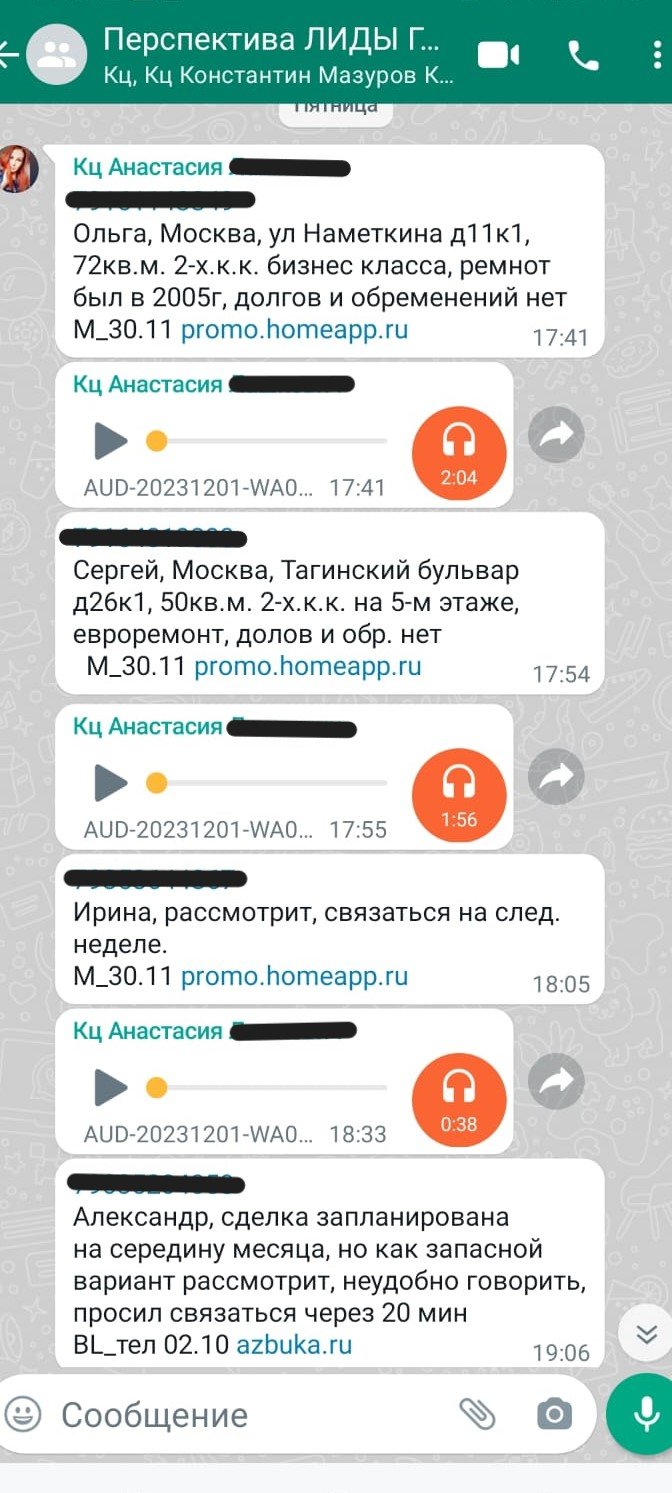 Когда номера пошли, а это случилось ровно через сутки, наш колл-центр оперативно прозванивал всех и передавал в рабочий чат заинтересованных клиентов с подробной информацией. Что хочет продать клиент, договоренностью на дальнейшее взаимодействие (дата, время) с агентом, а также прилагали аудиозапись переговоров. В скрипте мы прописали 9 вопросов, которые необходимо было уточнить у потенциального клиента.