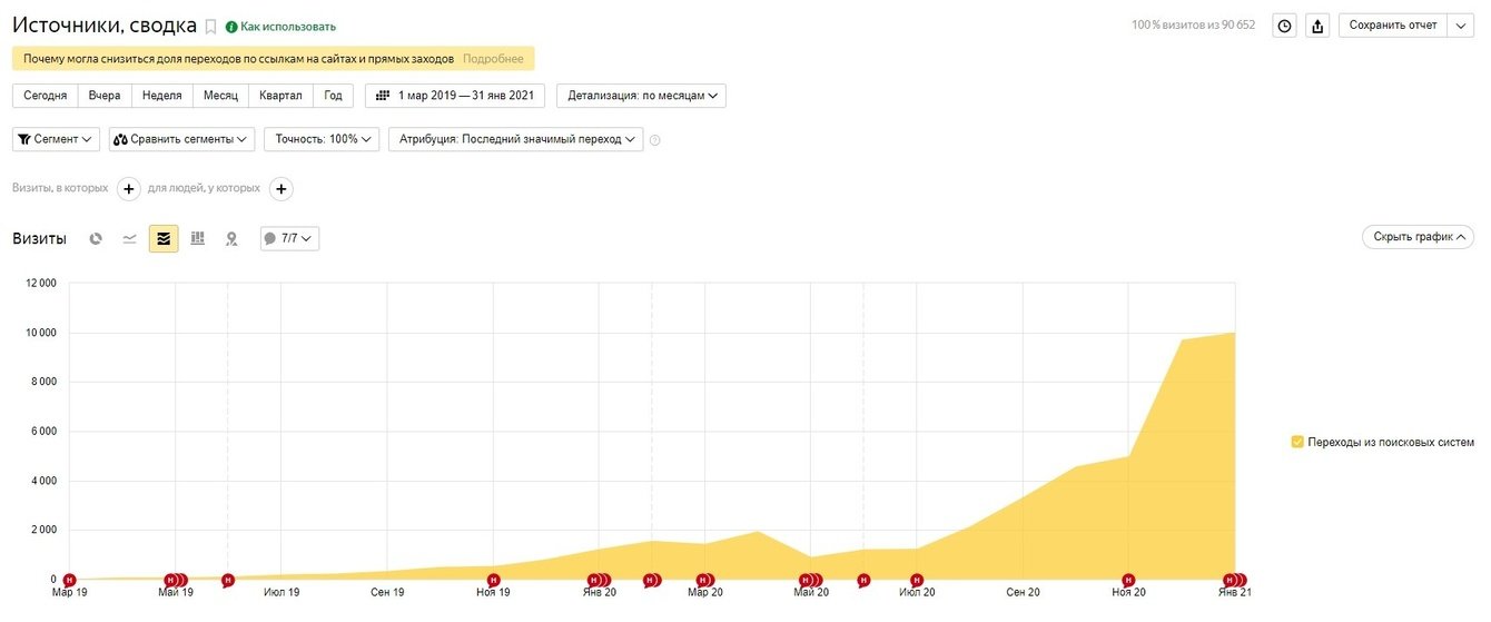 Посещаемость из поисковых систем выросла в 454 раза с 22 до 10008 визитов в месяц