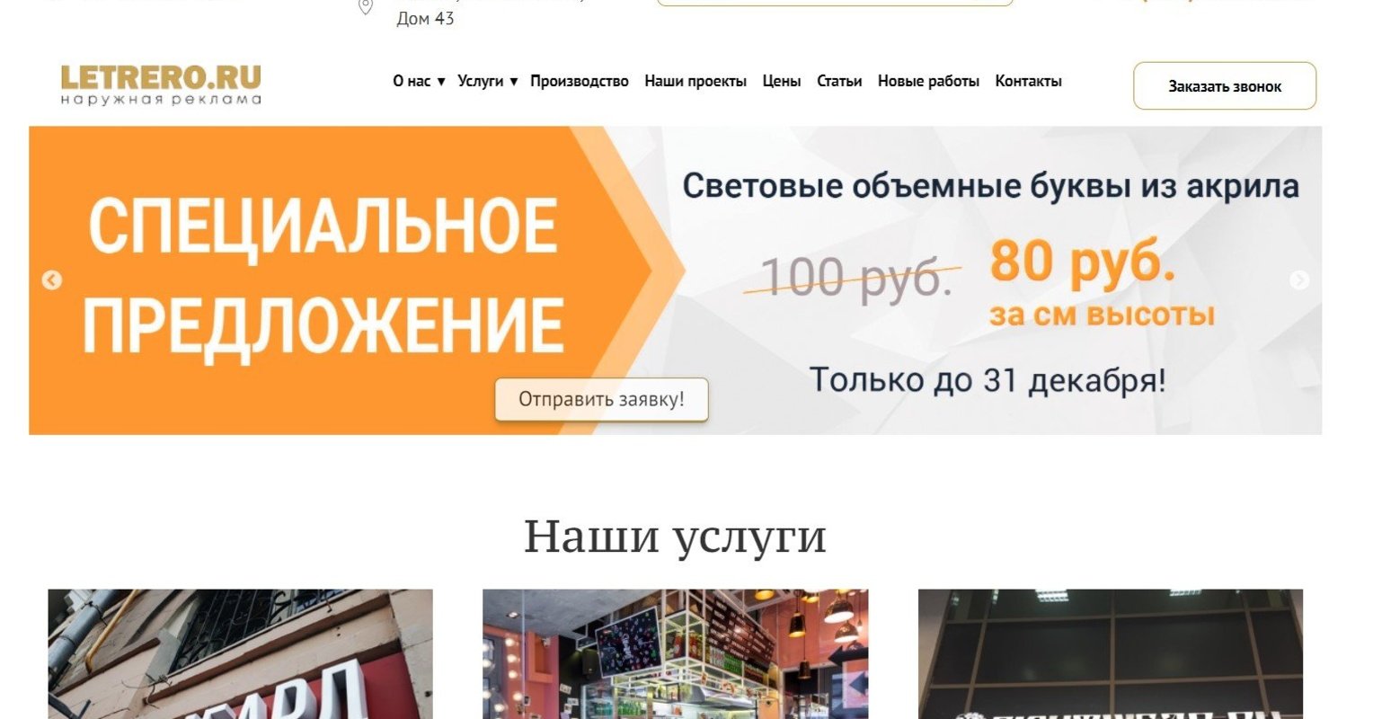 Компания "Летреро" осуществляет свою деятельность более 10 лет и приобрели за это время бесценный̆ опыт в сфере производства и монтажа наружной рекламы.