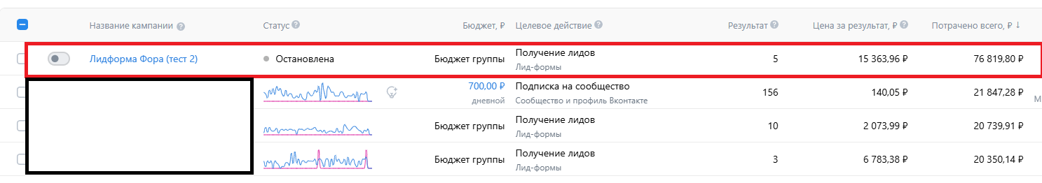 На этом этапе клиент решил остановить тестовую РК и внести корректировки.