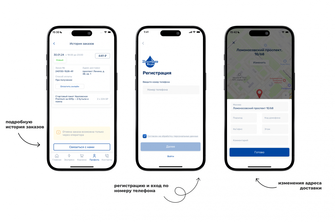 Реализовано приложение для доставки воды. Теперь клиенты видят обновленный современный дизайн, могут совершить оплату по сохраненной карте онлайн. Пользователи теперь также имеют доступ к истории заказов, где можно найти все детали о заказе, его статус. В карточке заказа пользователи могут отменить, повторить заказ. Для удобства авторизации реализован вход по номеру телефона.