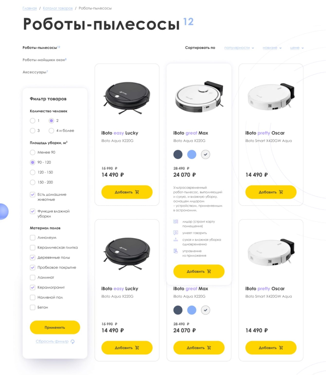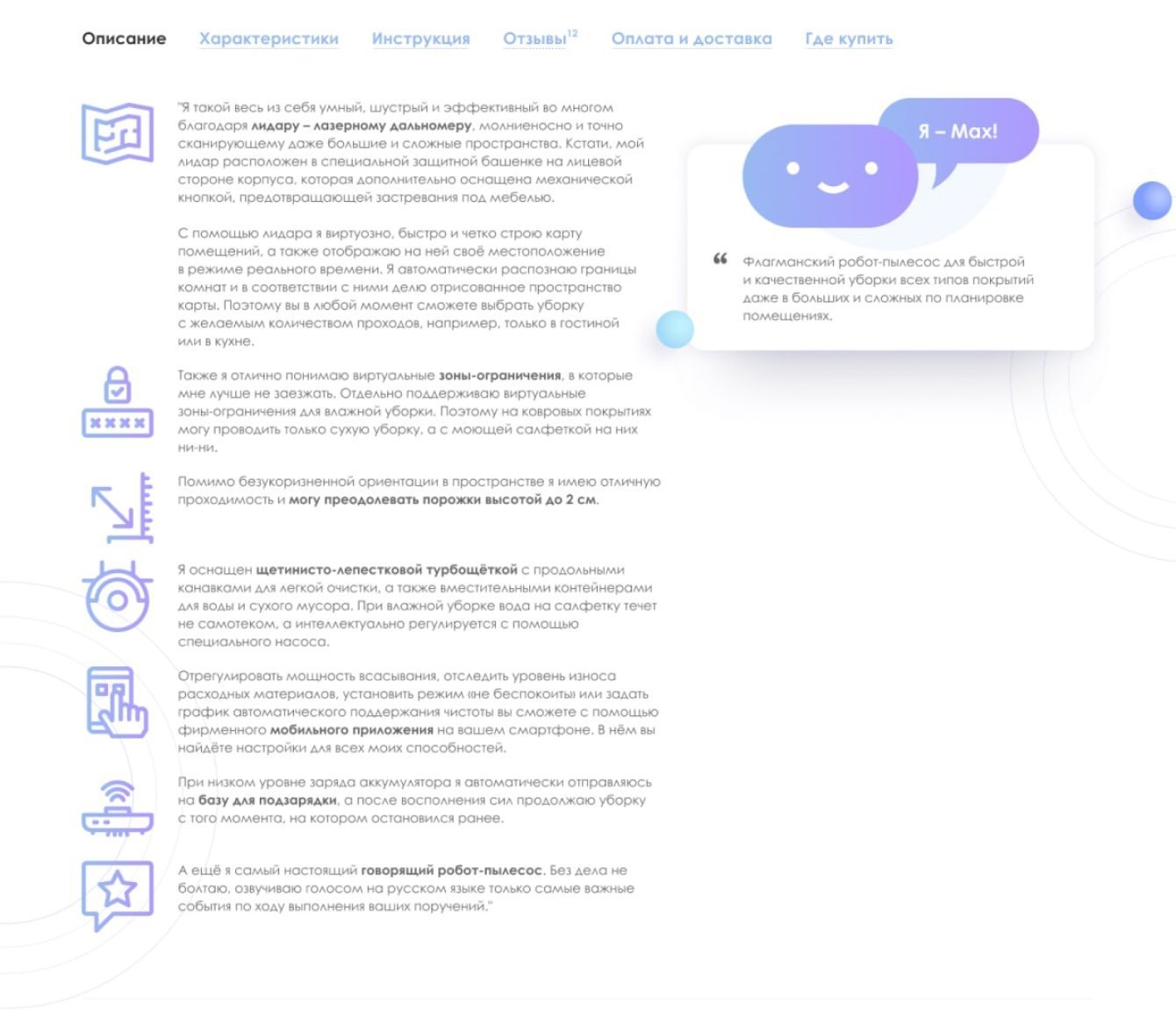 Сайт продаёт не робота, а ощущение уюта и комфорта — поэтому и подача контента более личная: это отличает проект от конкурентов. Каждый робот — индивидуален: у него есть имя, а в карточке он рассказывает о себе от своего лица.