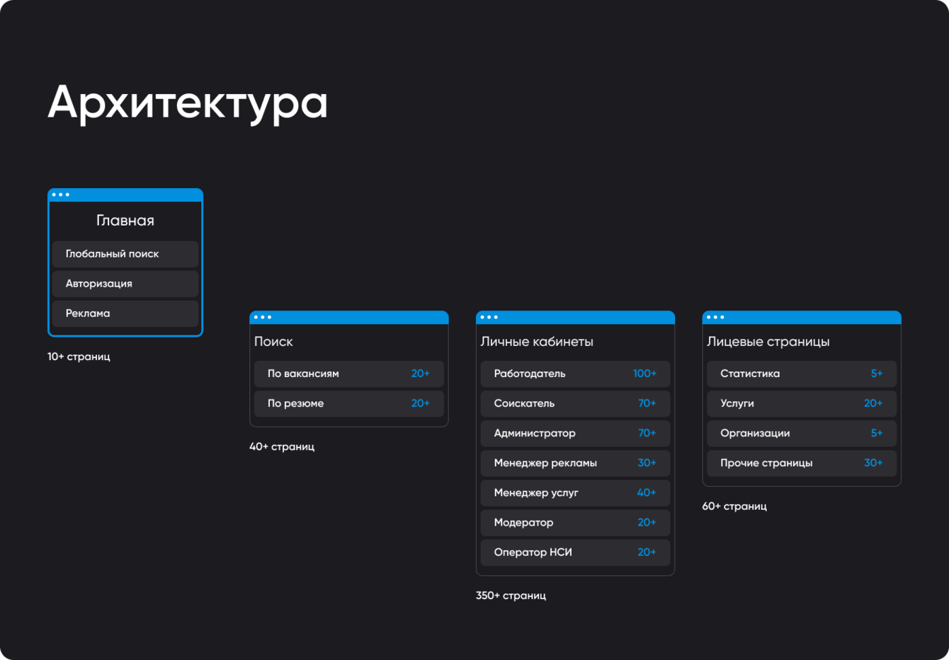 Проведена масштабная работа по созданию логичных пользовательских путей для каждой из семи ролей. Мы учли особенности использования адаптивных версий разными пользователями.