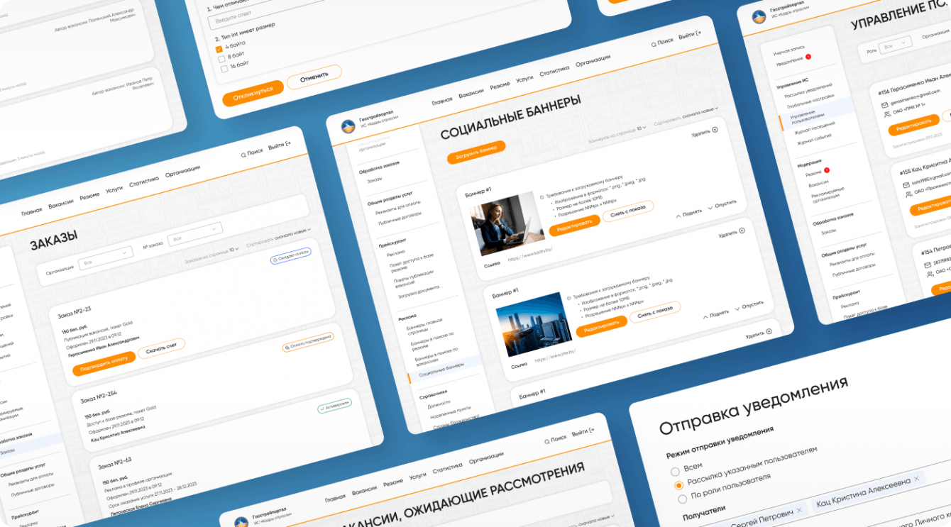 Разработать дизайн для масштабной информационной подсистемы «Кадры отрасли» – сервиса по поиску работы и сотрудников в строительной сфере. При проектировании было важно опираться на техническое задание и учесть разработанный бэкенд.