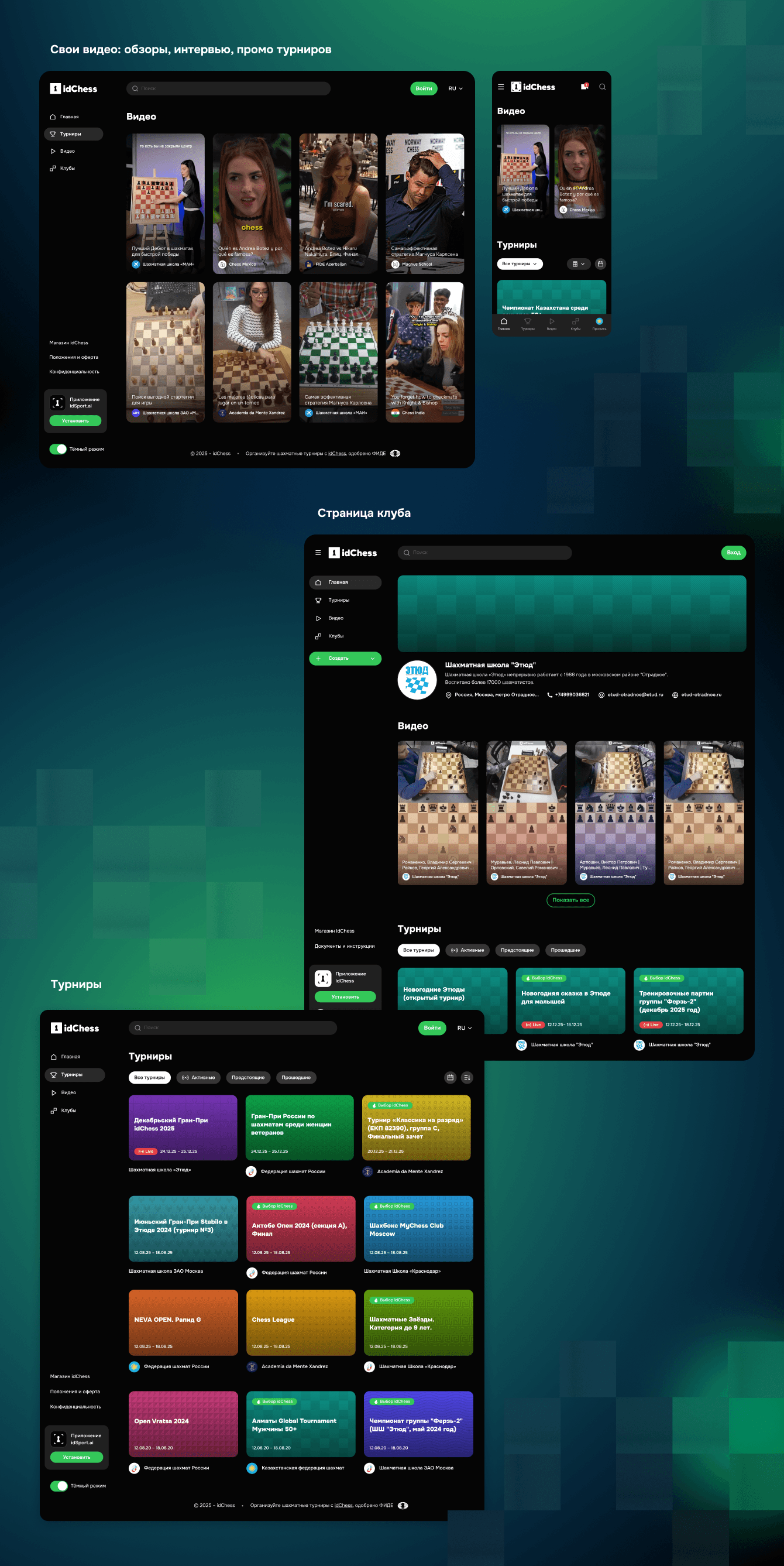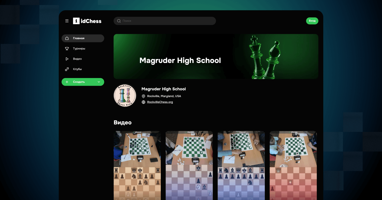 У каждого клуба есть своя страница: ее можно оформить под себя, добавить логотип, фон, описания и собрать на ней все турниры. На медиаплатформу можно выкладывать не только автоматически сгенерированные ролики через idChess, но и свои видео: обзоры, интервью и промо турниров.