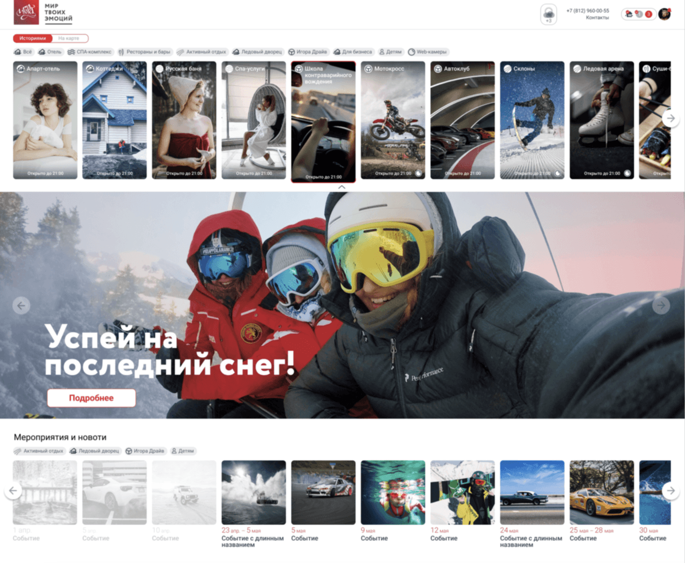 Результатом стало, то что Игора – это эмоции, приятные воспоминания, а это ничто иное, как истории. Истории = Stories. Популярный формат коротких видео в instagram и не только. Мы решили построить сайт по принципу визуала. «Зачем тексты и описания, когда хочется увидеть склон» – подумали мы. Тем более, что даже на старой версии сайта были разделы с доступам к видеокамерам.