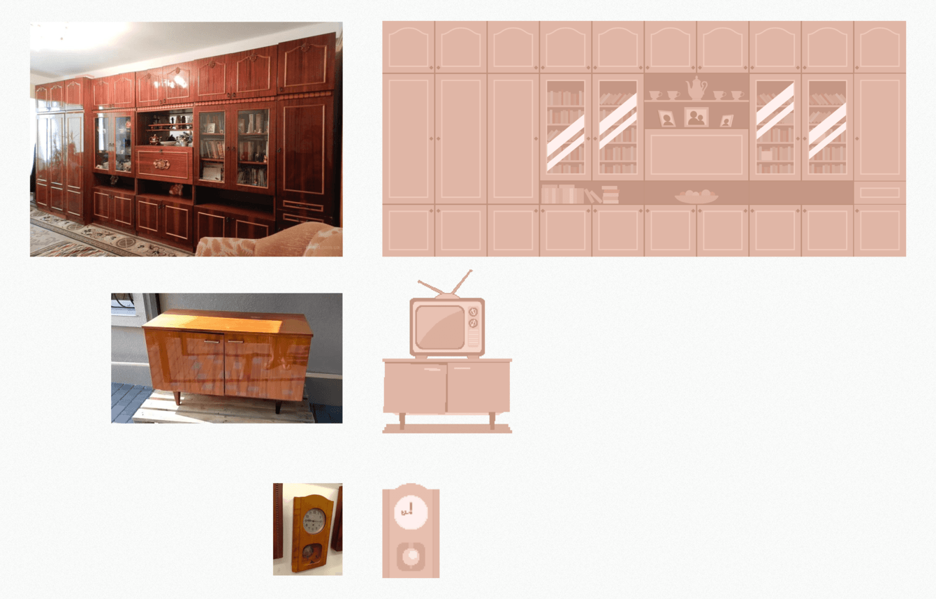 Найти пиксельную советскую мебель на стоках оказалось трудно, поэтому большинство предметов интерьера мы перерисовали с реальных.