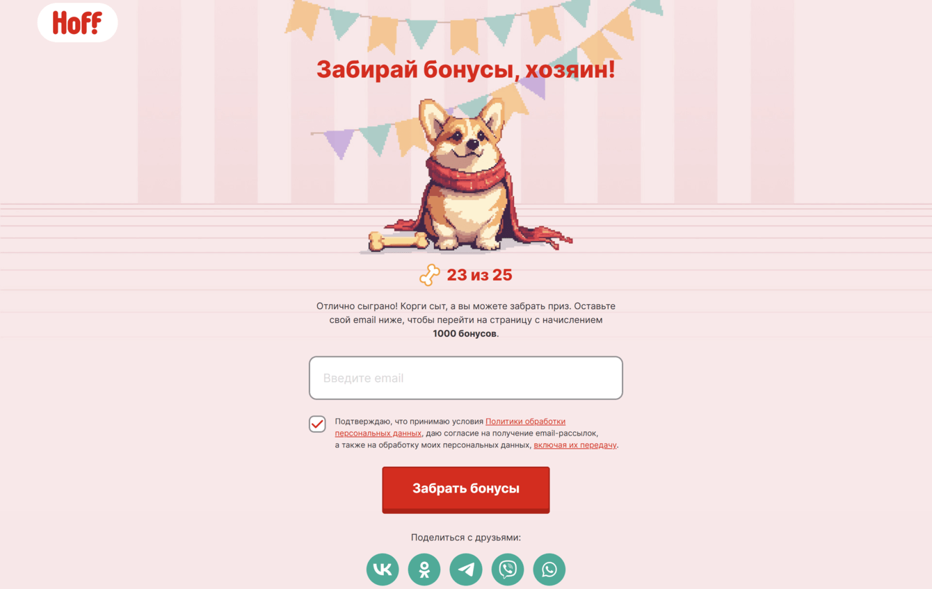 Для игры предусмотрели приз — 1000 бонусных рублей в программе лояльности Hoff. Чтобы получить их, пользователь должен: