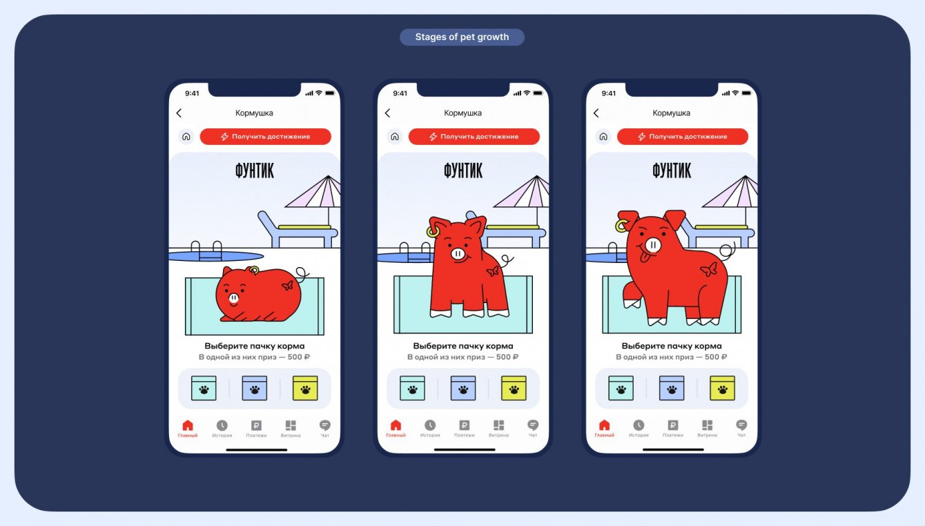 Дополнительно мы продумали целую систему прокачки персонажа и достижений за транзакции. Чтобы быстрее растить питомца, заботиться о нём, получать денежные вознаграждения и увеличивать вероятность выиграть один из главных призов, пользователь, по нашей задумке, должен был заходить в приложение и проводить транзакции по карте «Альфа-Банка».