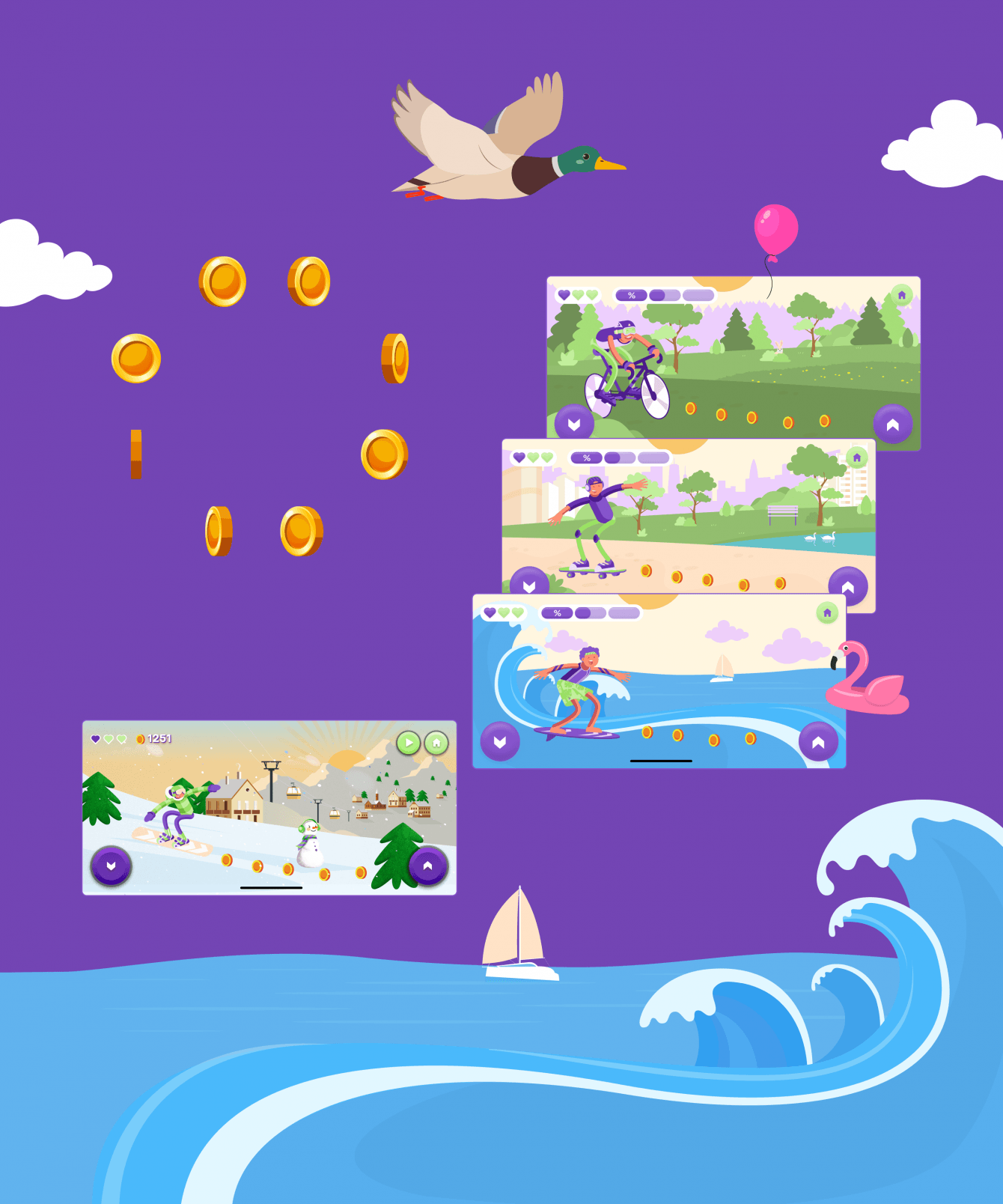 Сделали летний рескин зимней версии игры, теперь персонажи на летнем вайбе ?♀️ Выбираешь велосипедиста, скейтера или вейкбордиста, управляешь им и собираешь монетки. В простой игровой форме вовлекаем новую аудиторию и удерживаем старую, развлекаем и дарим кайфовые эмоции — это укрепляет эмоциональную связь пользователей с брендом.