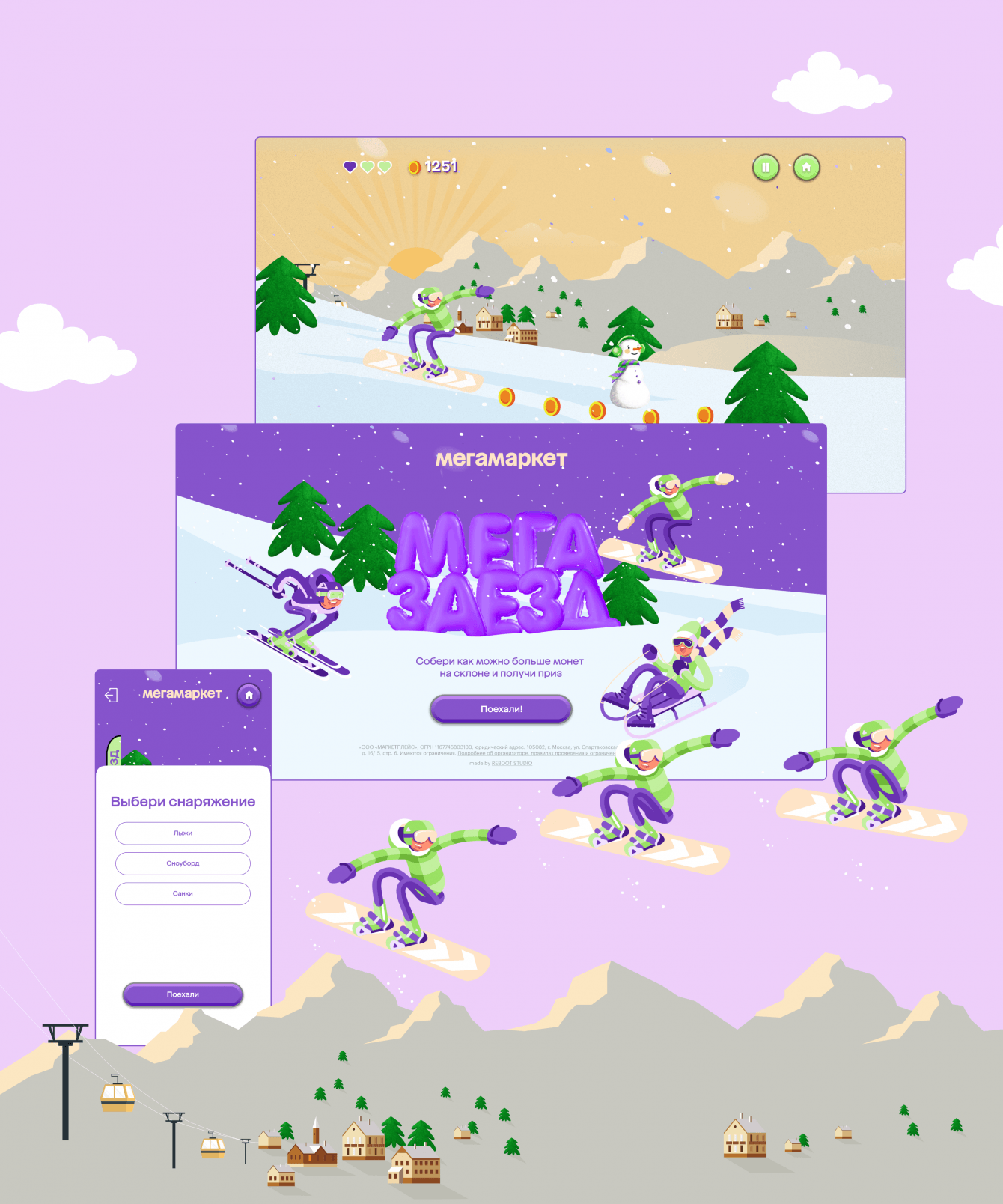 Разработать спецпроект для вовлечения новых, удержания старых и повышения лояльности к бренду Мегамаркет. Интересным вызовом была необходимость адаптировать проект не только под онлайн, но и офлайн работу на фестивалях по типу New star camp, где нужно дать возможность управлять героями игры с джойстика на нестандартных экранах.