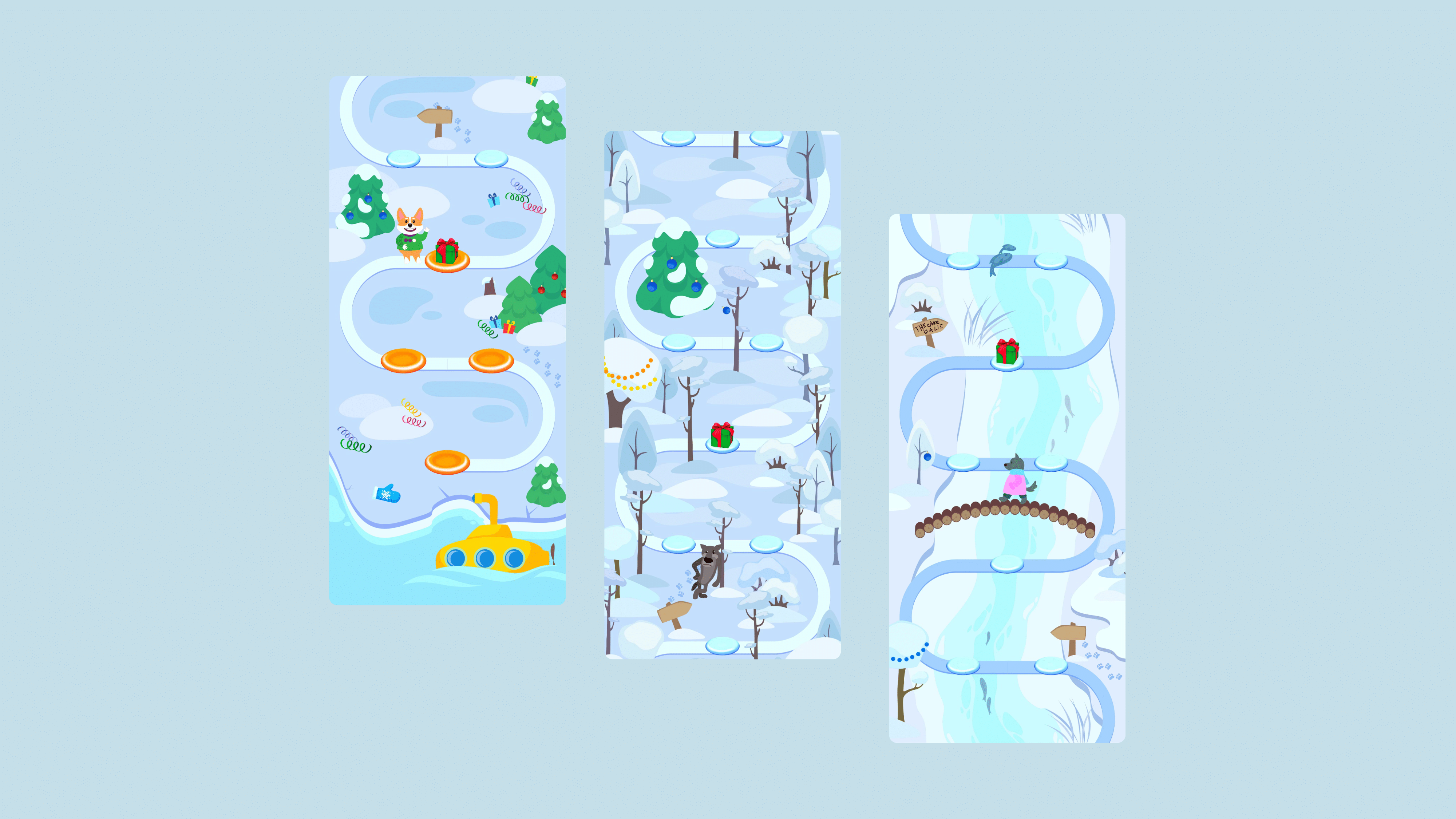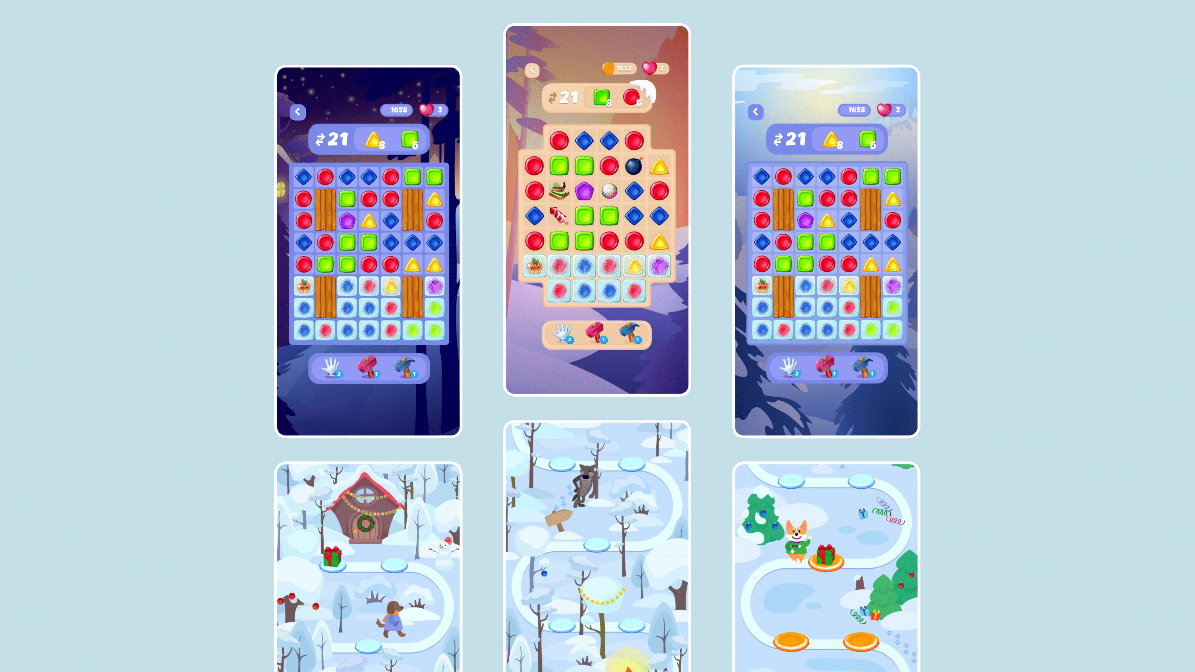 Отрисовали фоны-пейзажи на главном меню и уровнях «три в ряд» и все элементы игры от фишек до онбординга и «пасхалок» на карте уровней.