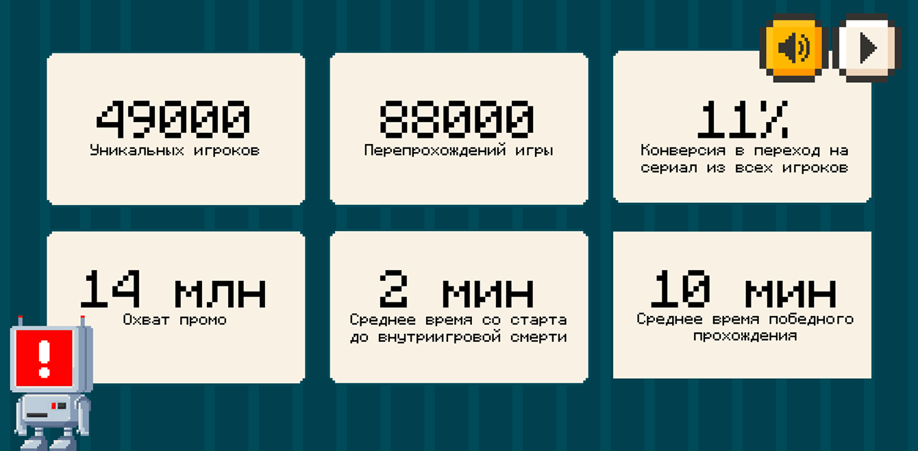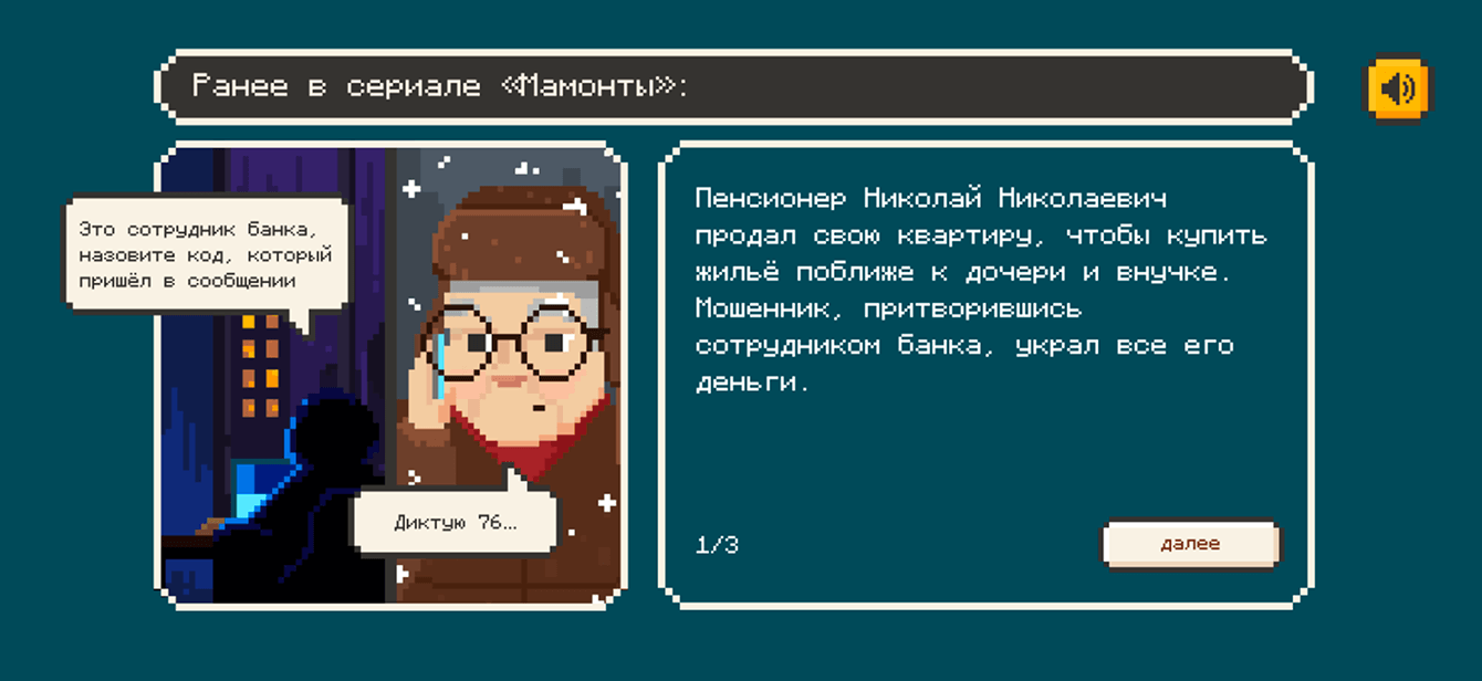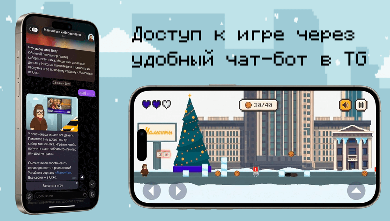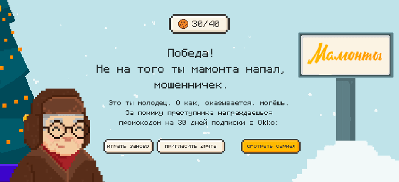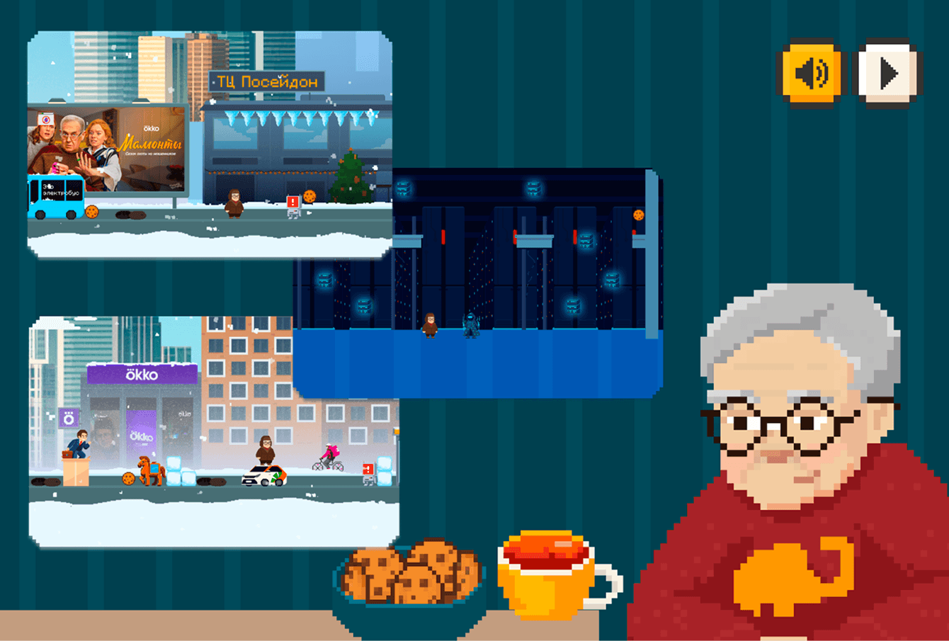 Мы превратили основную сюжетную линию сериала про кибермошенничество в ретро-игру: взяли за основу классический платформер «Марио» и адаптировали его под вселенную «Мамонтов». Мы создали простую и знакомую абсолютно всем возрастным сегментам аркаду, в которой пользователь играет за прототип главного героя сериала — пенсионера Николая Николаевича, который в прямом смысле догоняет мошенника, похитившего его сбережения.