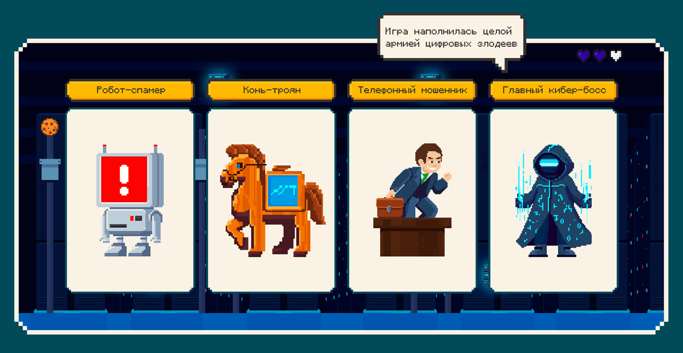 Задача пользователя — преодолеть опасный маршрут, уклоняясь от атак врагов, добраться до логова главного кибермошенника и разрушить серверы с данными, чтобы обезвредить его.