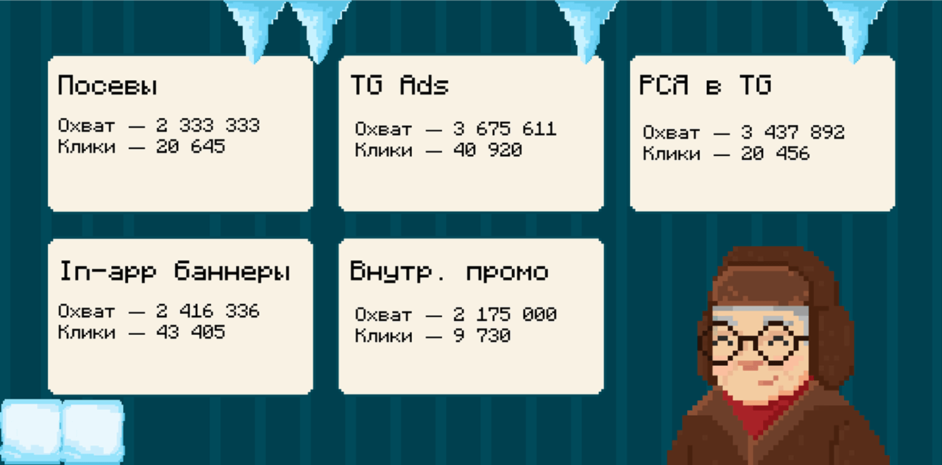 Удалось зацепить разные возрастные группы за счет комплексного промо через вариативные каналы, что стало доступным именно благодаря размещению игры в TG mini-app.