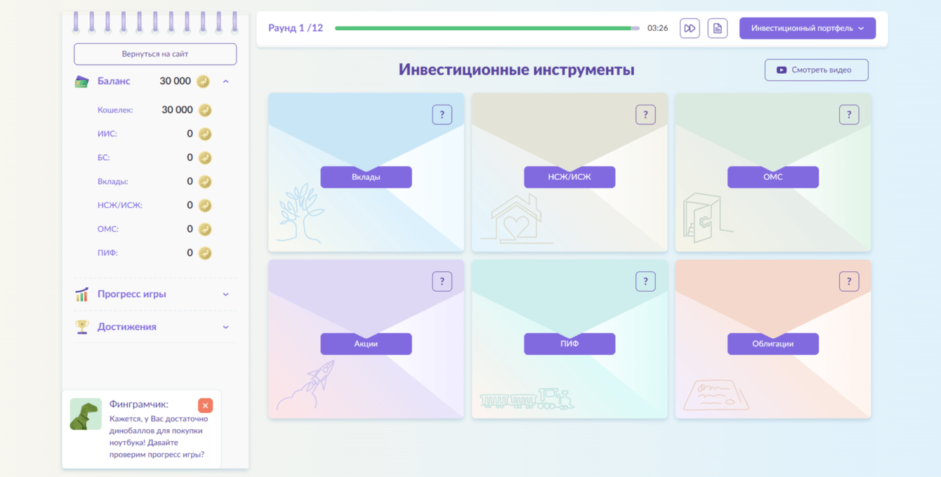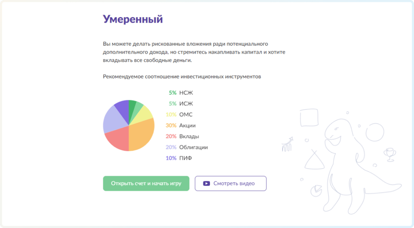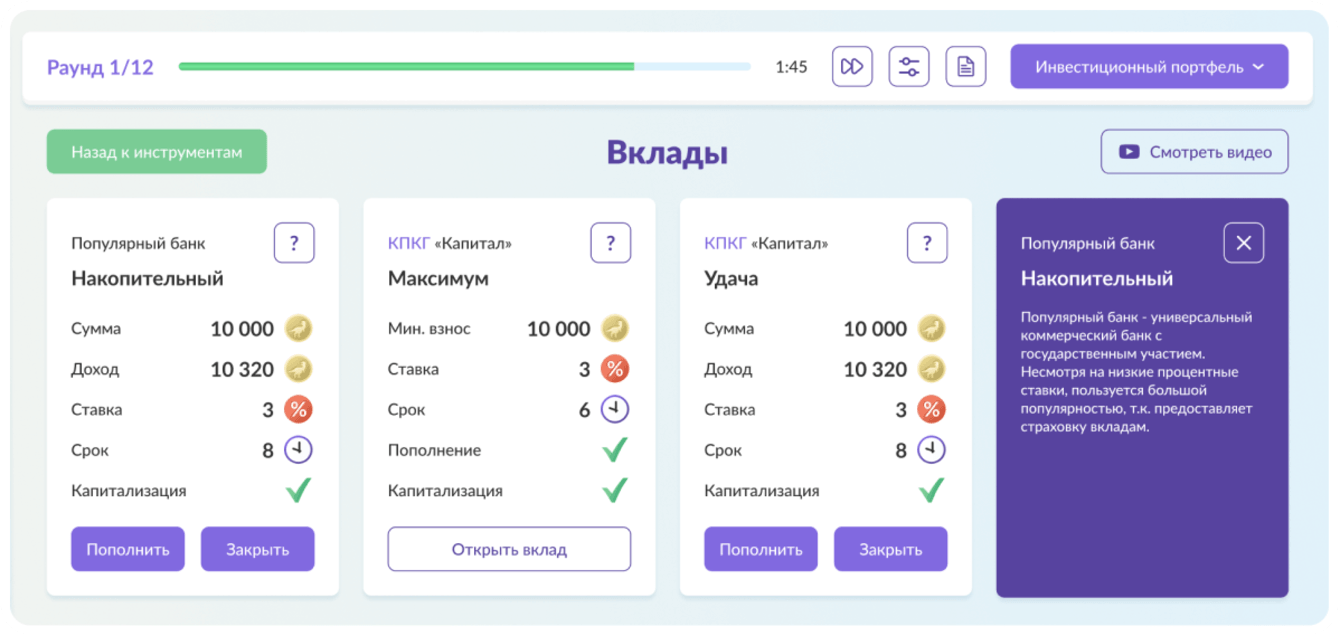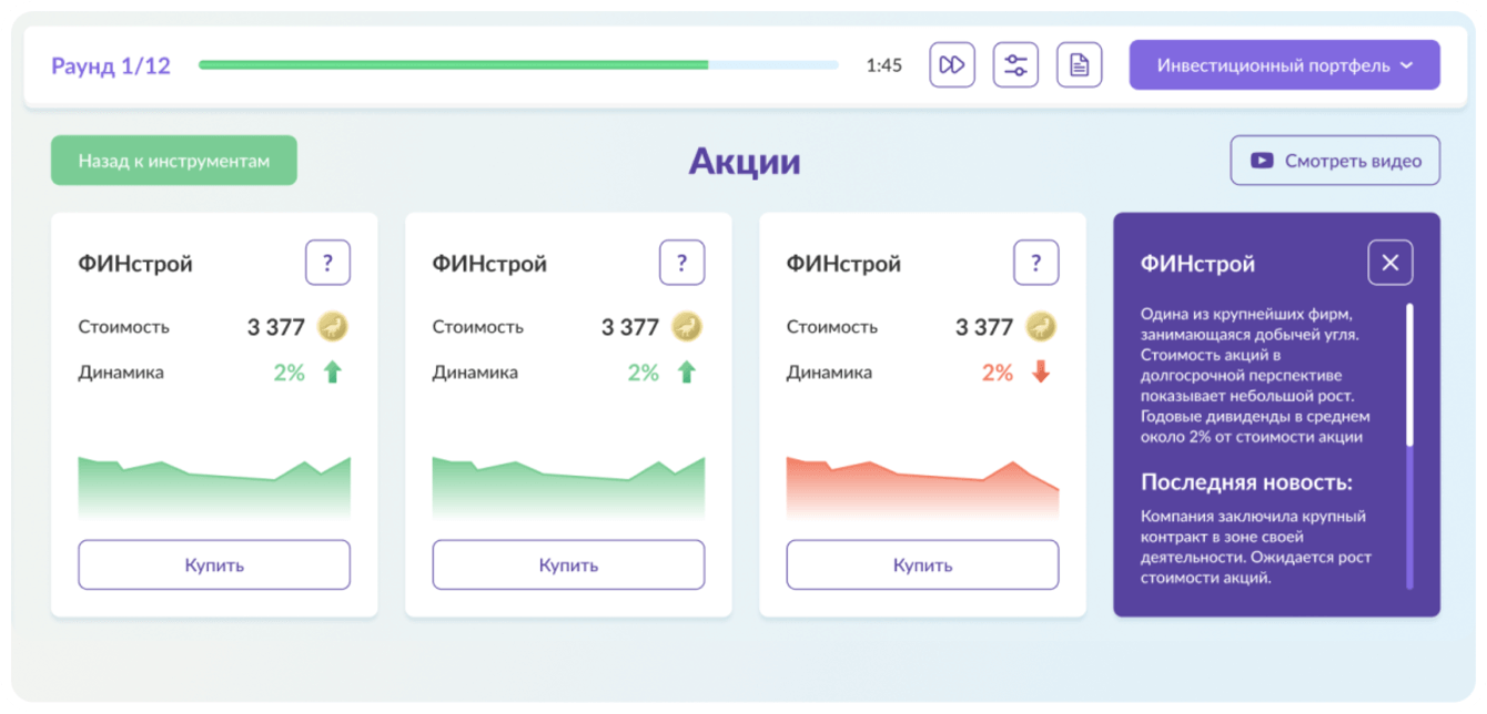На карточках инструментов находятся подсказки, которые помогают выбрать наиболее удачное решение для своего портфеля. Также в процессе игры мы ссылаемся на полезные статьи и видео с платформы.