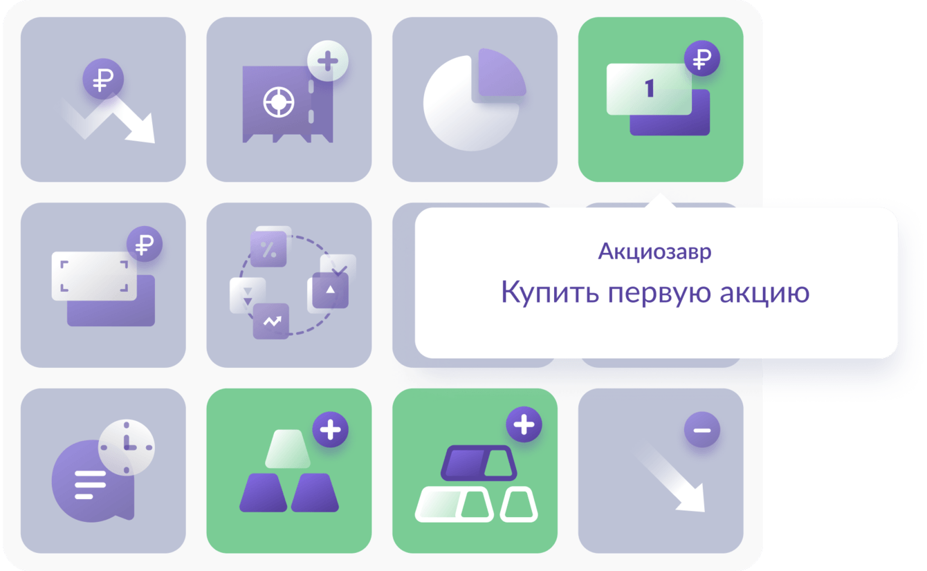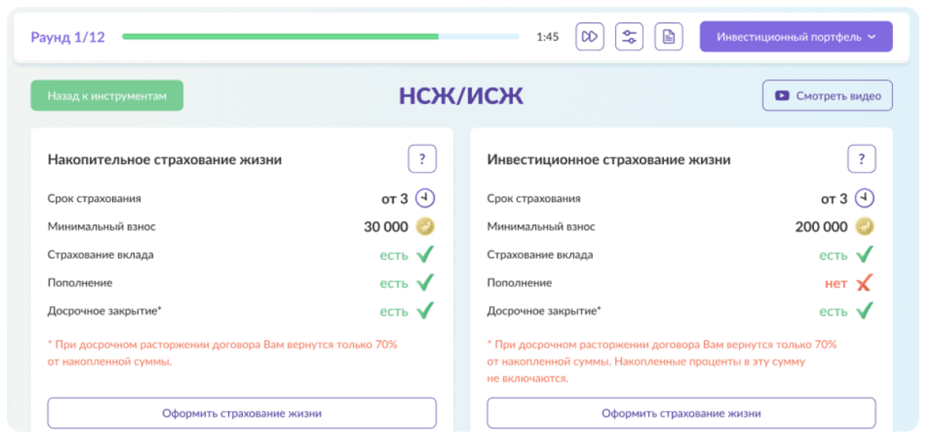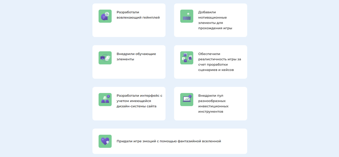 На карточках инструментов находятся подсказки, которые помогают выбрать наиболее удачное решение для своего портфеля. Также в процессе игры мы ссылаемся на полезные статьи и видео с платформы.