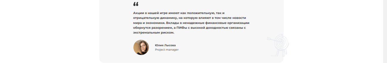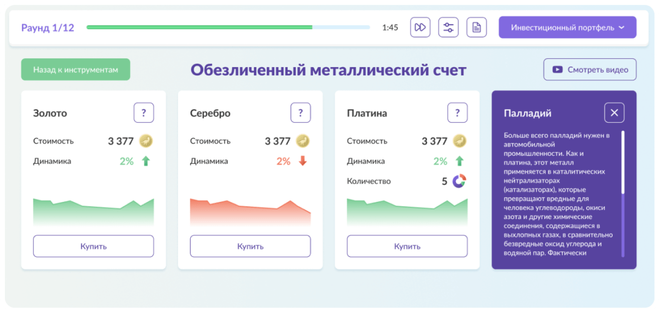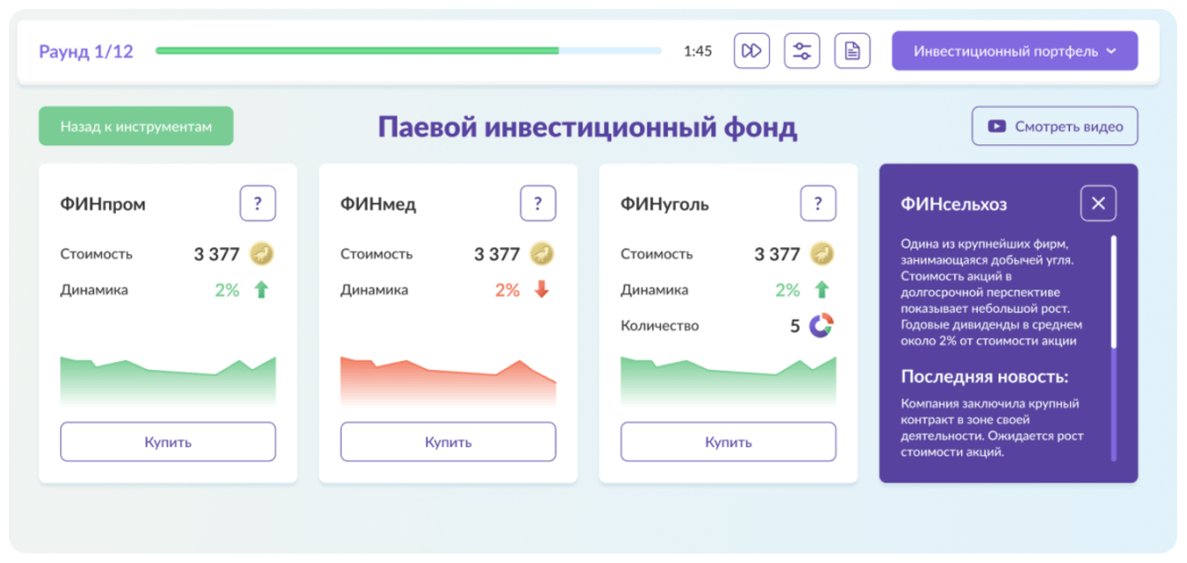 Совершая операции на виртуальном рынке, игрок знакомится с логикой работы финансовых инструментов и учится выстраивать инвестиционные стратегии.