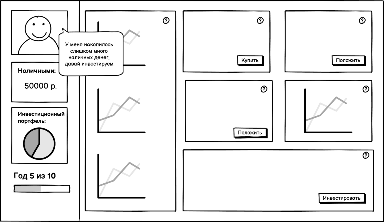 В жизни результат вложений инвестор видит спустя время, поэтому мы решили, что игре нужны раунды. Для наглядности за один один раунд в игре проходит год, так как большинство инструментов проще отслеживать в разрезе этого периода.
