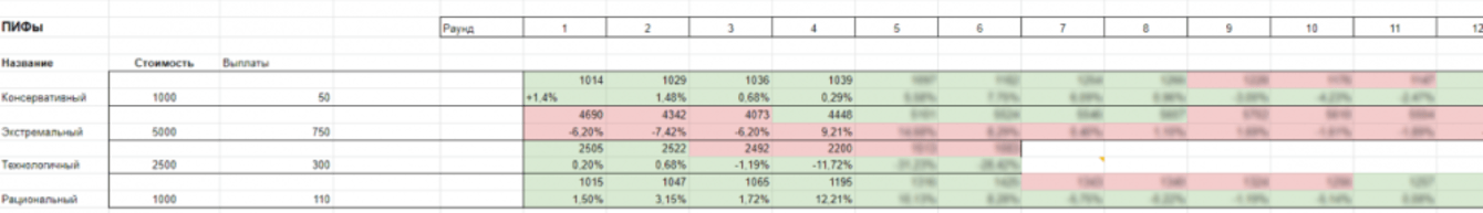 Предварительно сценарии мы прописали в таблице, где указали все необходимые условия и динамику инструмента в каждом раунде.
