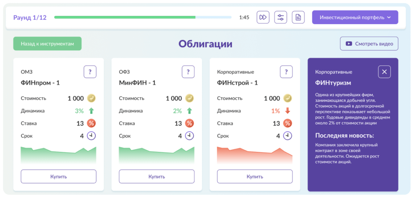 В игре реализованы сценарии для самых распространенных инвестиционных инструментов: