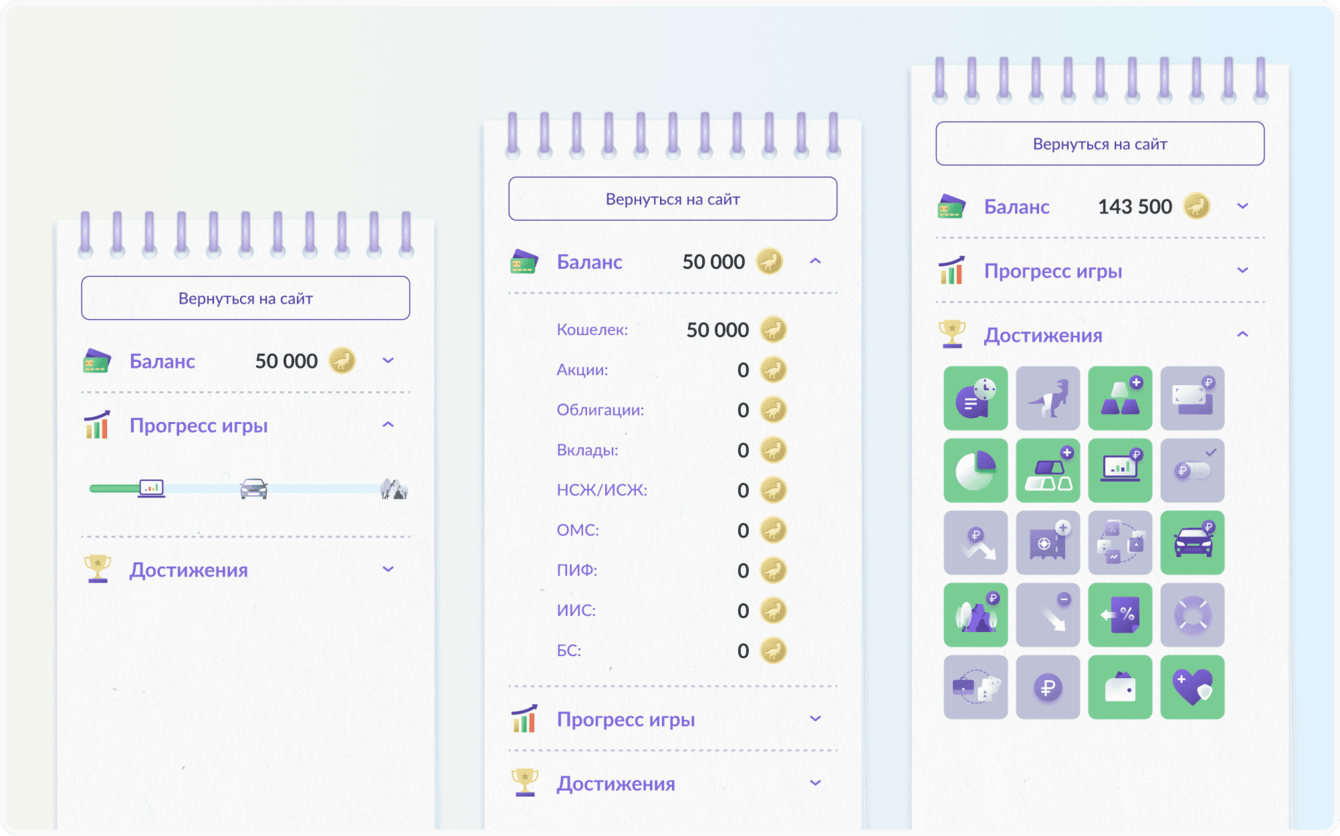 Для контроля инвестиционного портфеля мы добавили сайдбар со статистикой. Он всегда находится на экране и позволяет непрерывно отслеживать динамику вложений и общую картину по инвестициям. Здесь же доступен прогресс достижения финансовых целей — по мере заполнения строки игрок понимает, насколько он близок к финалу. Поскольку многие люди занимаются учетом расходов и ведут трекер привычек в ежедневниках, для сайдбара было принято решение взять за основу образ вертикального блокнота.