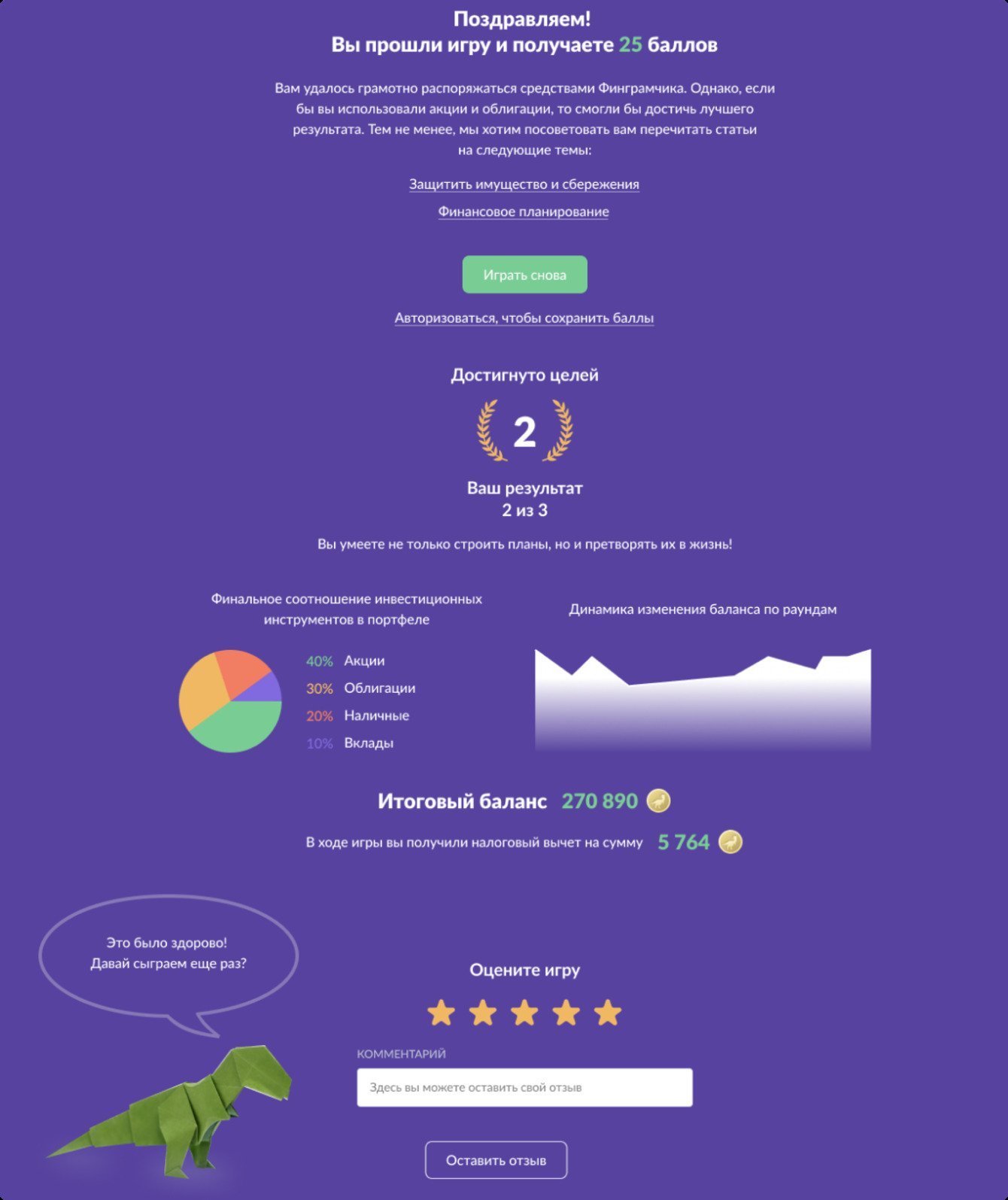 Во время игры мы предлагаем пройти викторину по финансовой грамотности, чтобы дополнительно проверить свои знания. Прохождение не обязательно, но чтобы мотивировать игрока, мы даем дополнительные баллы за правильные ответы.