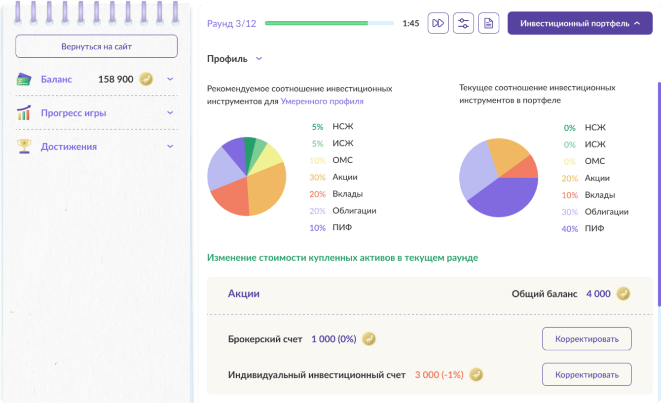 Когда игрок совершает покупку ценных бумаг или открытие вклада, активы отправляются в инвестиционный портфель. В нем можно отслеживать динамику изменения вложенных средств и распоряжаться активами на счетах. Для удобства игрока на вкладке «Профиль» показаны диаграммы с соотношением инвестиционных инструментов, где можно проверить соответствие рекомендованной стратегии.