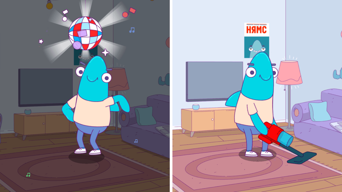 Мы отрисовали 12 состояний персонажи и 4 разных фона-локации, которые меняются в зависимости от достигнутого пользователем грейда. С каждым новым уровнем акула становится все солиднее, опытнее и зубастее.