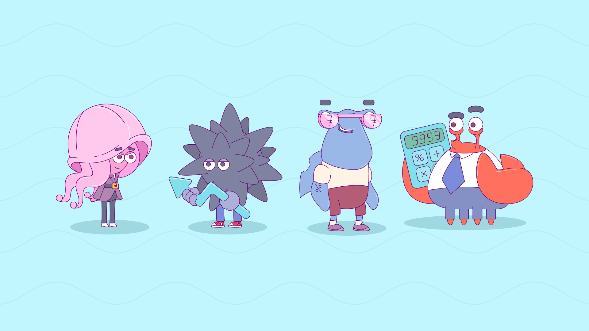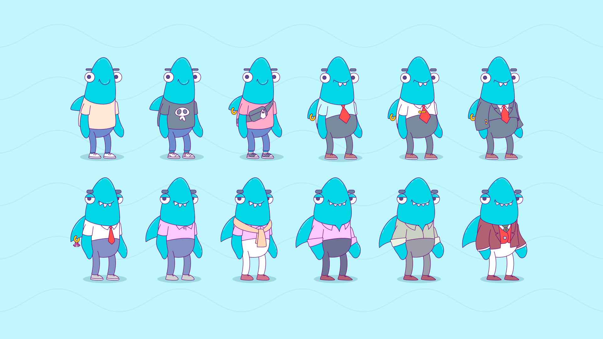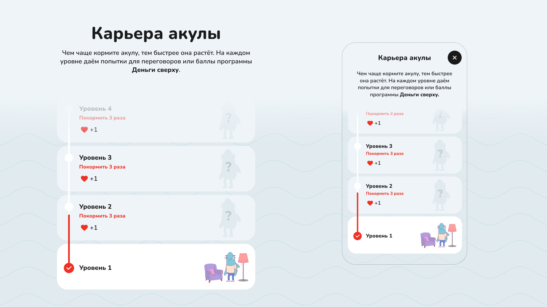 Мы отрисовали 12 состояний персонажи и 4 разных фона-локации, которые меняются в зависимости от достигнутого пользователем грейда. С каждым новым уровнем акула становится все солиднее, опытнее и зубастее.