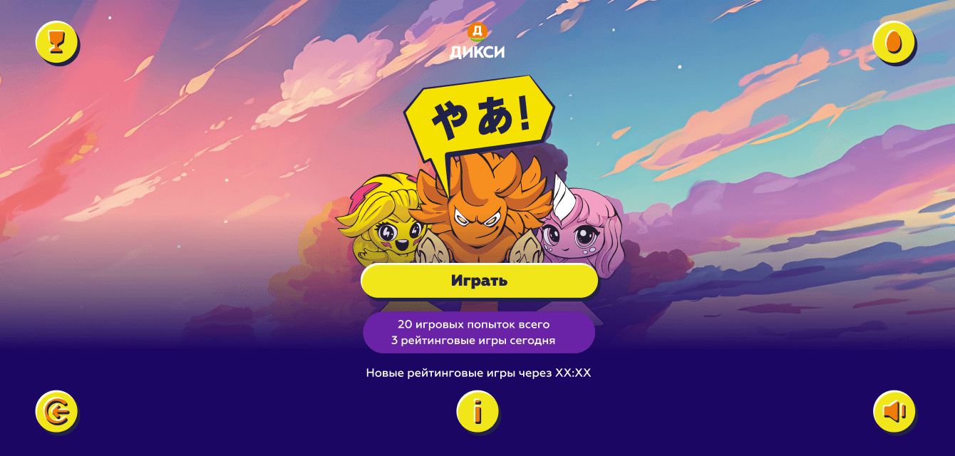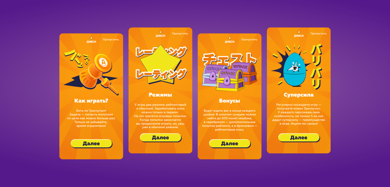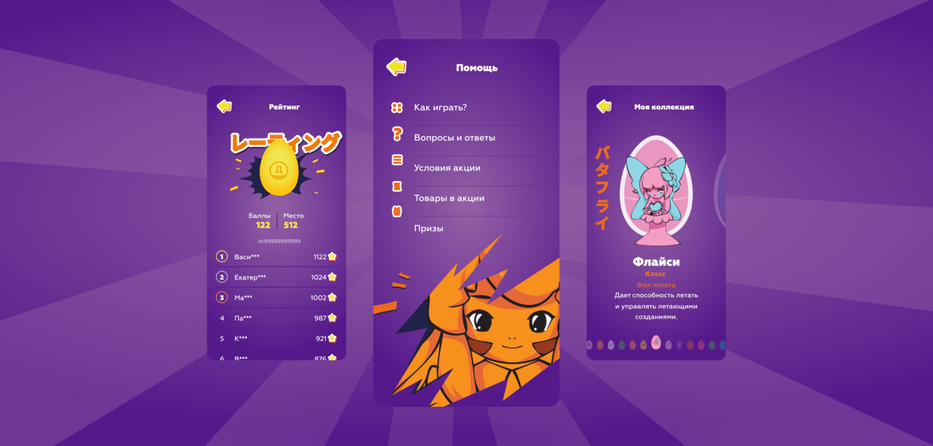 Мы взяли за основу аниме-сеттинг, созданный «Дикси», и упаковала в яркую игру. Последнюю решили сделать максимально простой, сфокусировавшись больше на персонажах: игроку нужно бить по яйцам, появляющимся из лунок, набирая очки рейтинга.