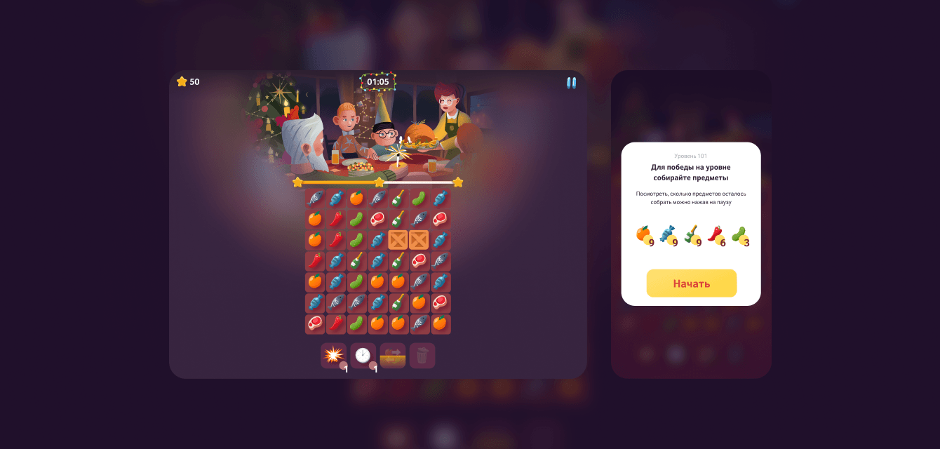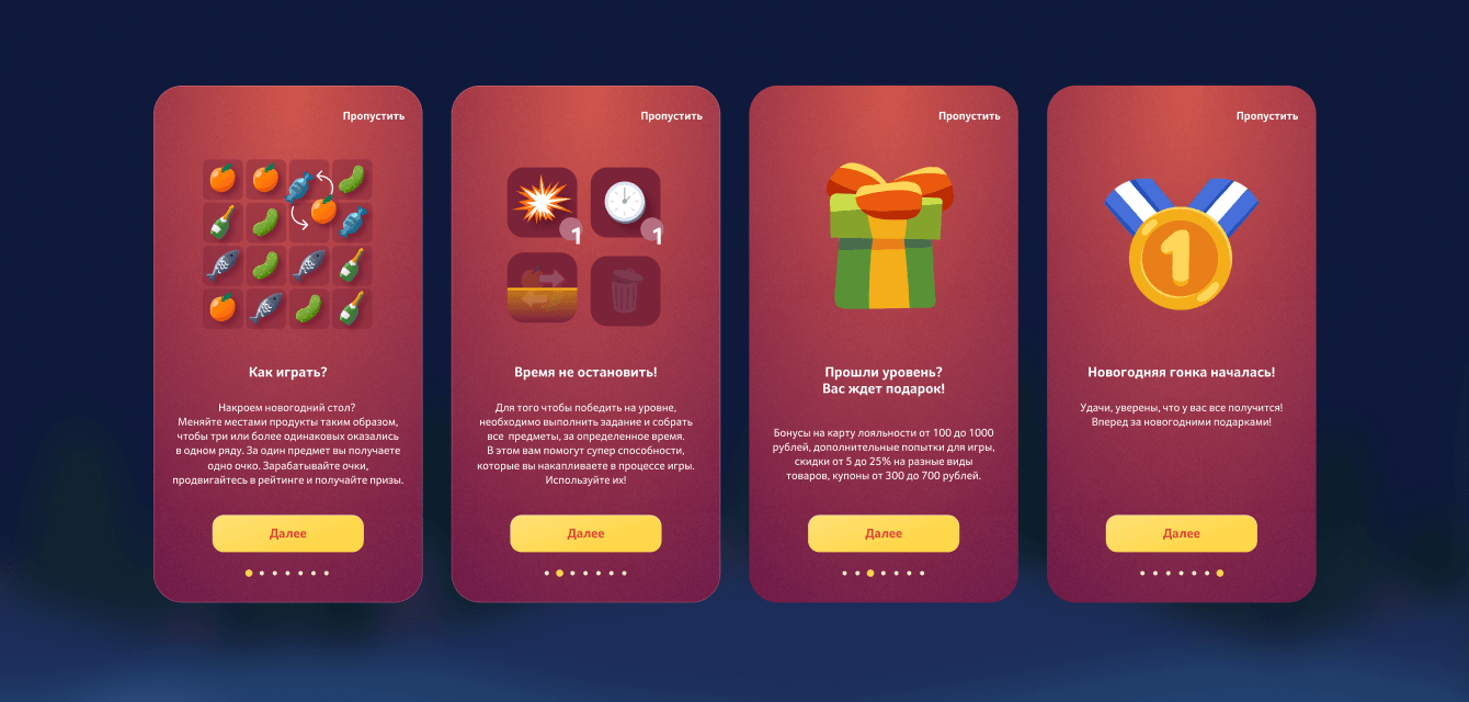 В основе дизайна — уютные иллюстрации в теплых цветах – большая семья, праздничный стол и другие элементы Нового года. В игровой части объекты также выполнены в общей food-стилистике. Пользователь собирает огурчики, конфеты, мандарины и другие всем знакомые продукты «с праздничного стола».