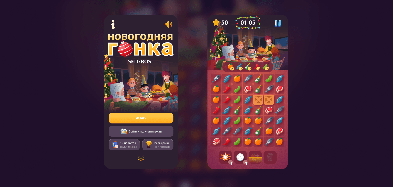 Команда Selgros обратилась к нам с задачей придумать и реализовать для них игровую механику в предновогодний сезон. Нужно было активировать клиентов, мотивировать «закупаться» к праздникам именно в магазинах их сети, подсветить конкретные категории товаров, выделиться на фоне конкурентов. И, разумеется, поддержать атмосферу праздника, наградить участников настоящими подарками под Новый год. Спецпроект должен был быть быстрым и недорогим.