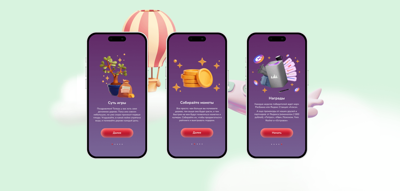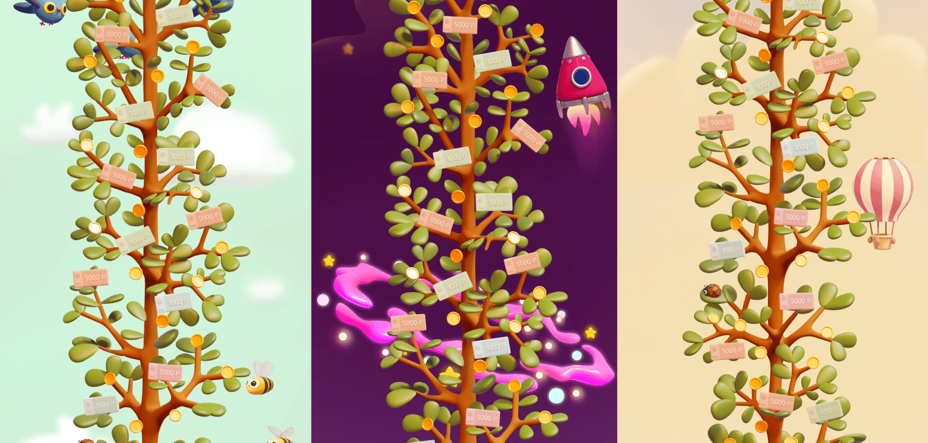 Мы собрали пул подходящих под все вводные бизнеса механик и креативные рамки под них. Из всех принесенных механик в итоге выбрали «Денежный урожай». Игру, построенную на миксе тамагочи и лутбоксов. Задача пользователя — поливать и растить свое дерево, а затем собирать с него урожай из призов. Чтобы полить дерево нужно выбрать лутбокс — предварительно угадать в какой лейке вода.