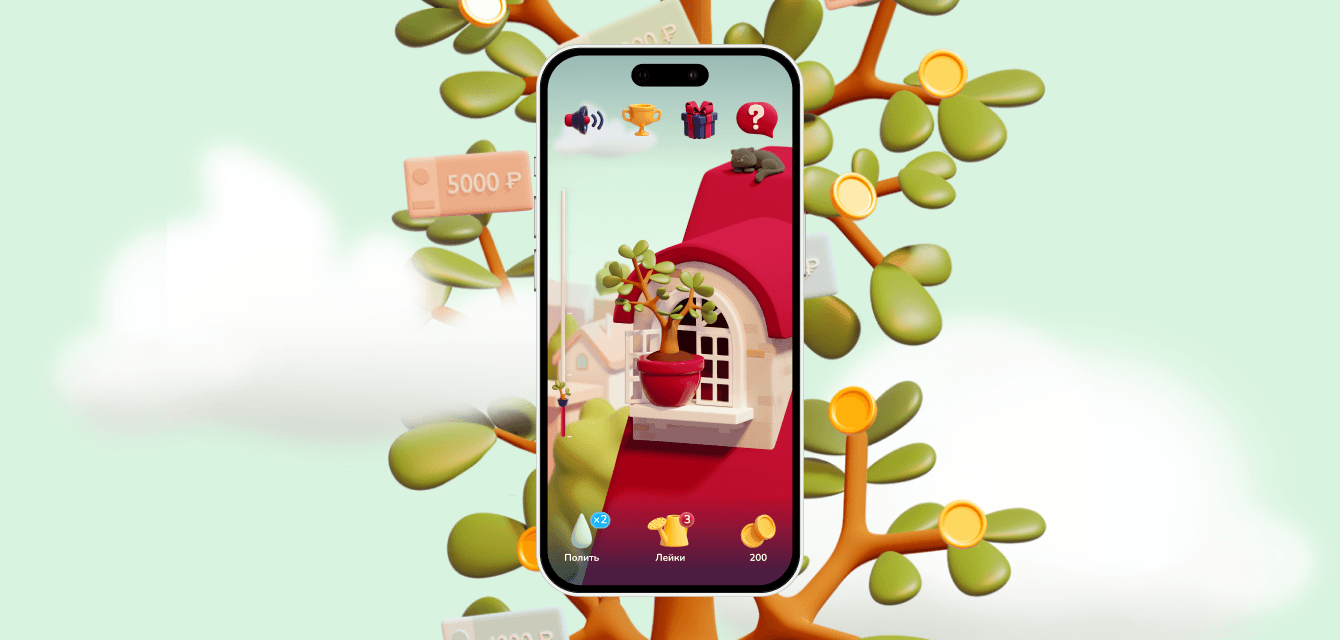 Мы собрали пул подходящих под все вводные бизнеса механик и креативные рамки под них. Из всех принесенных механик в итоге выбрали «Денежный урожай». Игру, построенную на миксе тамагочи и лутбоксов. Задача пользователя — поливать и растить свое дерево, а затем собирать с него урожай из призов. Чтобы полить дерево нужно выбрать лутбокс — предварительно угадать в какой лейке вода.