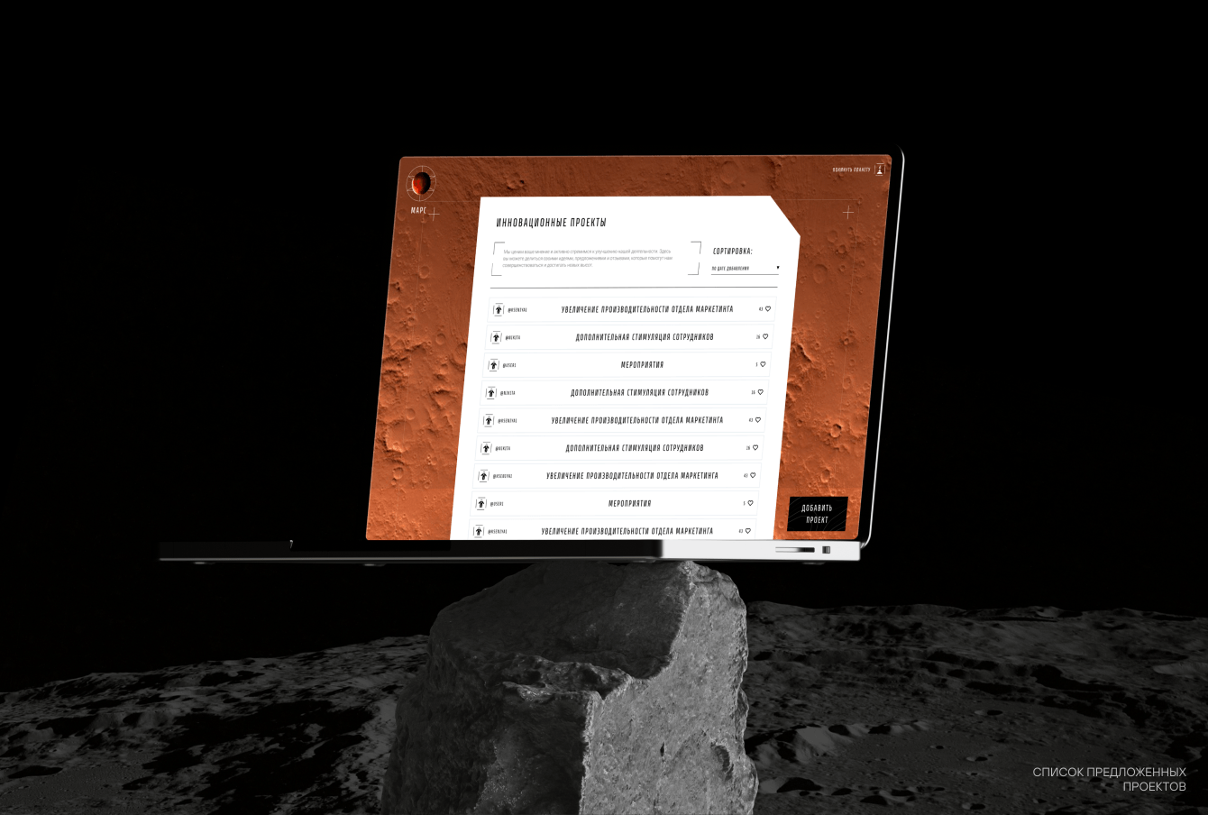 Марс — активность заключается в том, что нужно рассказать, что полезного и инновационного для компании ты придумал, за это получаешь лайки, которые конвертируются в баллы. Есть критерии по полезности и уникальности проекта. Предложение, которое набрало больше лайков, не только позволяет повысить рейтинг, но и дает шанс рассмотрения и внедрения его руководством.