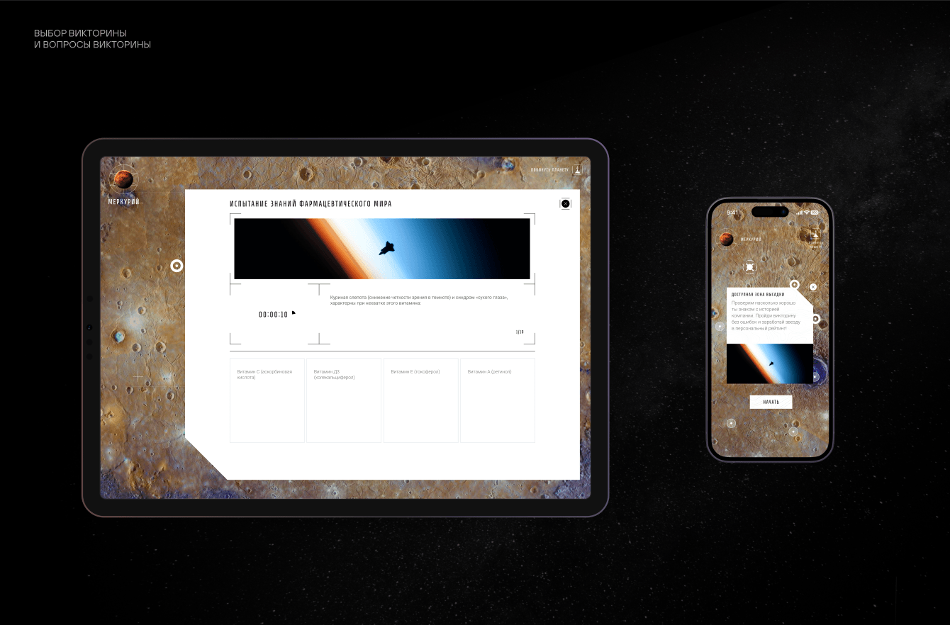 Мы пошли нестандартным путем: начали не с разработки прототипа, а с предложения по концепции, чтобы нагляднее продемонстрировать клиенту свое предложение. В качестве референса взяли идею атмосферы игр двухтысячных. Для большей игровой вовлеченности сделали космический дизайн без привязки к медицинской тематике и цветам бренда. Подготовили несколько вариантов, с первого раза выбрали и согласовали оптимальную концепцию.