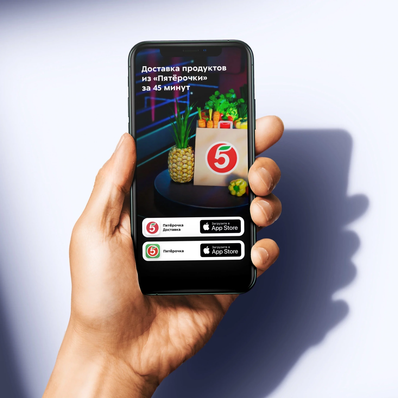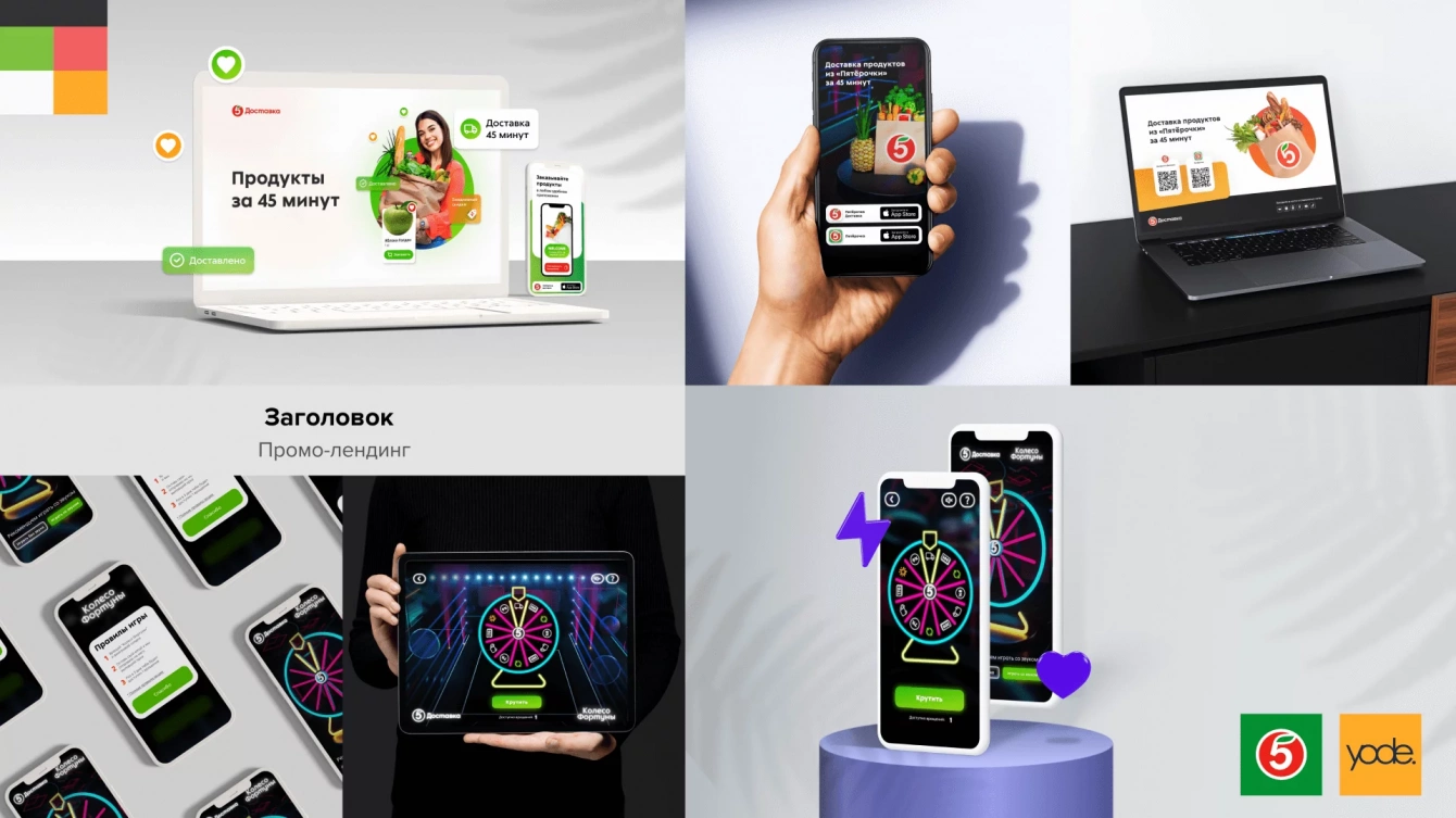 Мы выполнили редизайн лендинга dostavka.5ka.ru, внедрив в него мини-игру «Колесо фортуны». Механика игры заключается в том, что пользователь крутит рулетку, и ему рандомно выпадают призы в виде промокодов на покупки в «Пятёрочке». Также мы изменили карту покрытия и информацию о скачивании приложения.