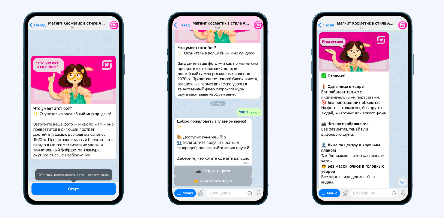 Для сети «Магнит» был создан Telegram-бот с интеграцией нейросетевой генерации изображений в стиле ар-деко. Проект стал частью промо-акции, в рамках которой пользователи могли загрузить фотографию и получить уникальный портрет с фирменным логотипом. Дополнительным драйвером роста базы стала реферальная система: приглашая друзей, участники получали новые попытки генерации. Таким образом «Магнит» получил современный канал коммуникации с аудиторией и инструмент вовлечения в экосистему бренда.