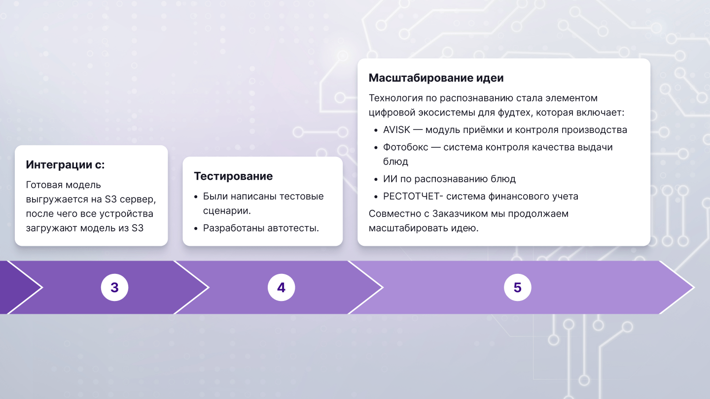 Первые тесты показывали время обработки около 3-4 секунд. Но после ряда доработок мы смогли сократить время до 1,5-2 секунд. Сейчас блюда определяются практически мгновенно, и персонал тратит на это минимальное время.