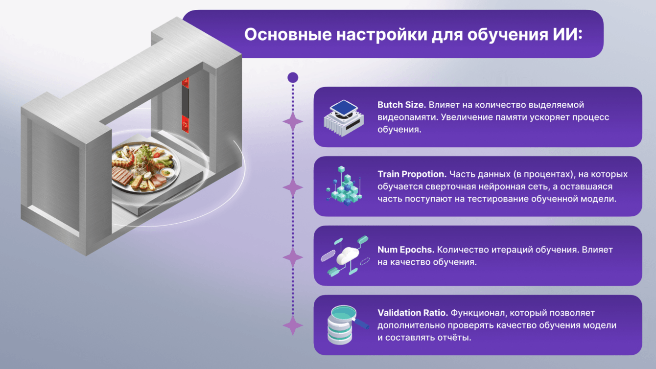 1. После оптимизации сверточной сети, балансировки датасетов и подготовки фотографий, определение блюд занимало 1,5-2 секунды на Raspberry Pi. На компьютере с GPU распознавание происходит за доли секунды.
