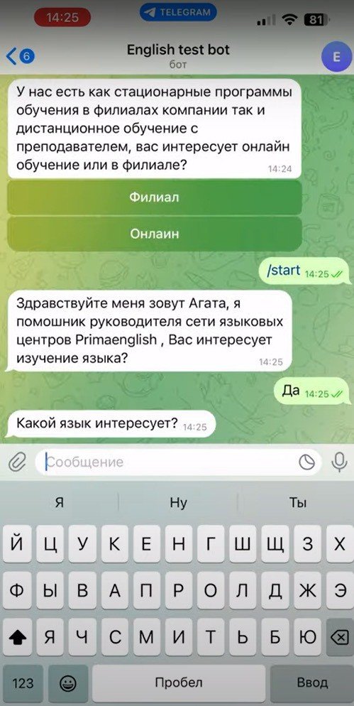 В результате бот мог самостоятельно, без участия человека, завершать весь цикл продаж, начиная с первого сообщения клиента в мессенджере и заканчивая оплатой курса английского языка.