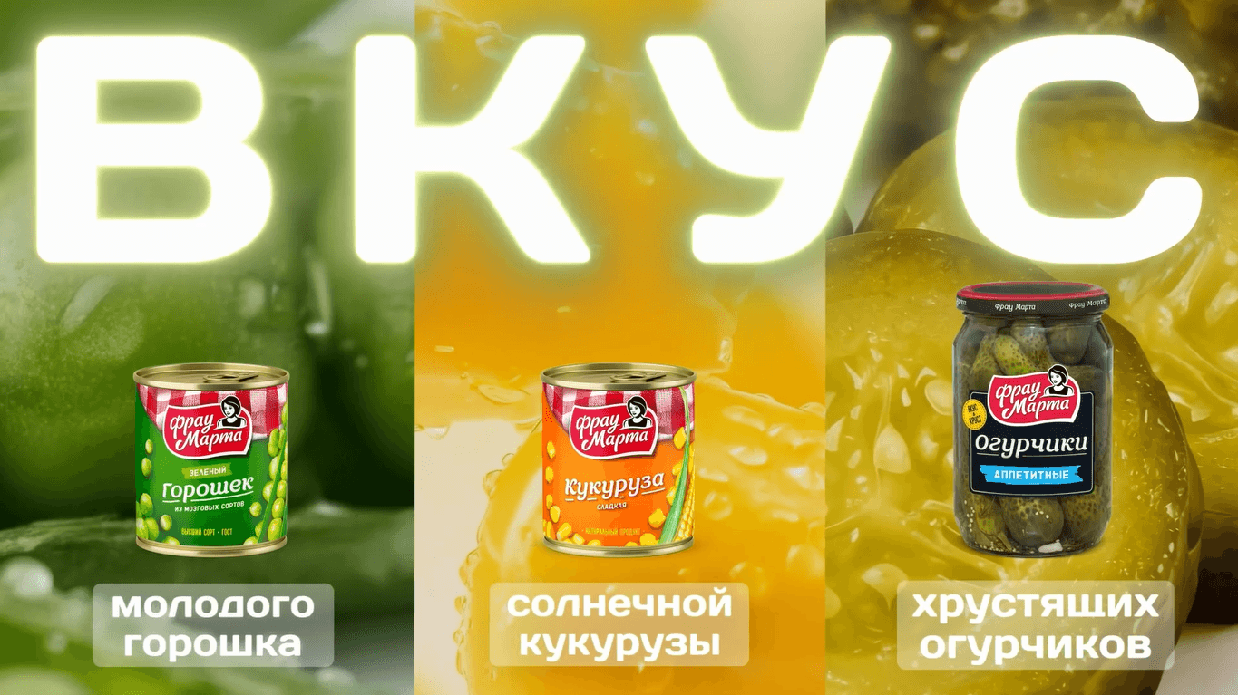 Еще нам нужно было собрать общий ролик со всеми продуктами. За основу взяли макропланы из персональных роликов для горошка, кукурузы и огурчиков. Чтобы стилистические выделить ролик, взяли изображения банок в 2D, а для анимаций привлекли моушен-дизайнера.