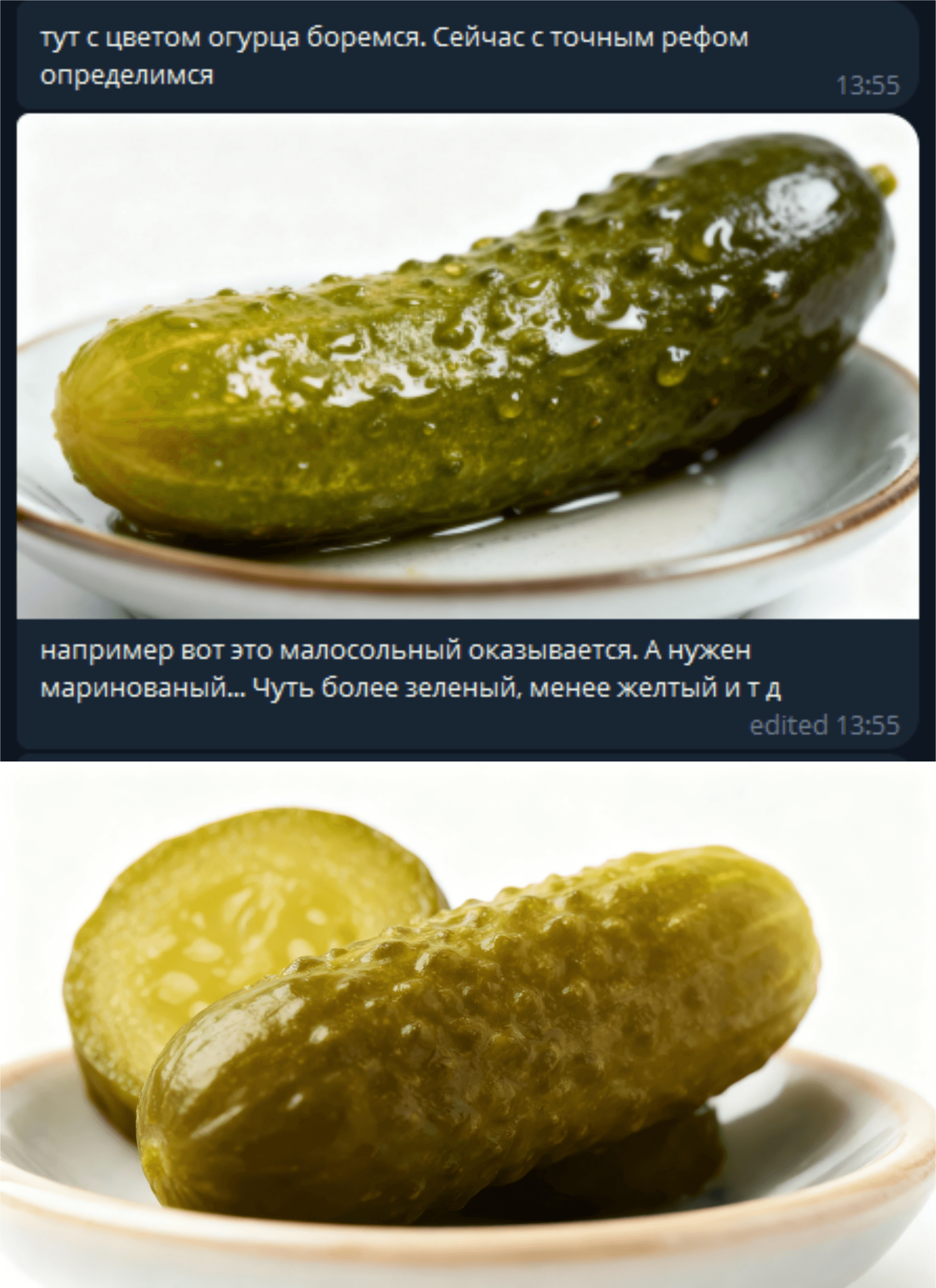 Самая мучительная битва развернулась за цвет маринованного огурца. Если оттенок зелёного получался слишком тёмным — огурец выглядел свежим. Слишком светлый — похож на малосольный. Нужно было найти тот самый идеальный средний «маринованный» оттенок, и это оказалось невероятно сложно.