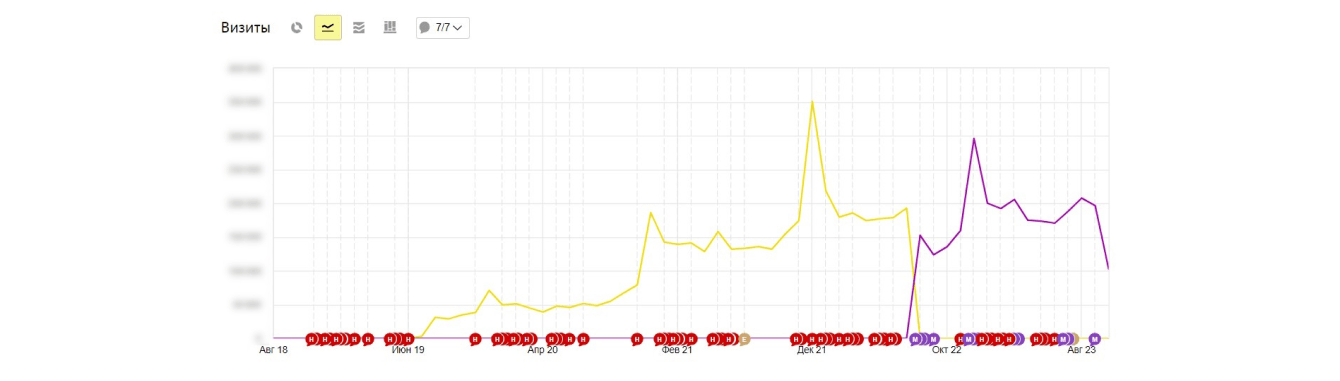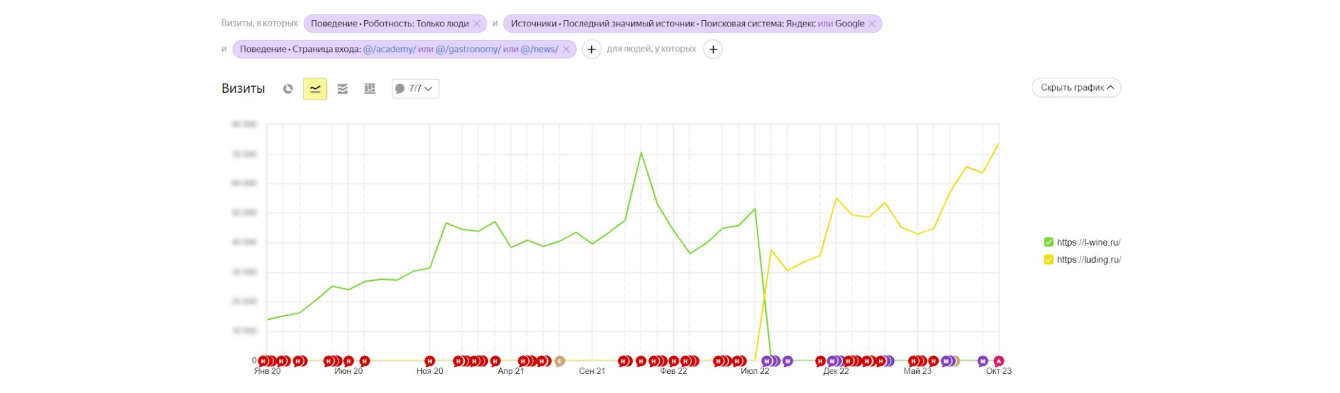Несмотря на то, что переезд прошел технически правильно, он, безусловно, вызвал у проекта «стресс». Трафик ожидаемо снизился, его восстановление до прежних значений заняло несколько месяцев. Показатели полностью восстановились и продолжают расти. На графике видна динамика посещаемости коммерческого раздела. Желтый график — трафик l-wine.ru, фиолетовый — luding.ru.