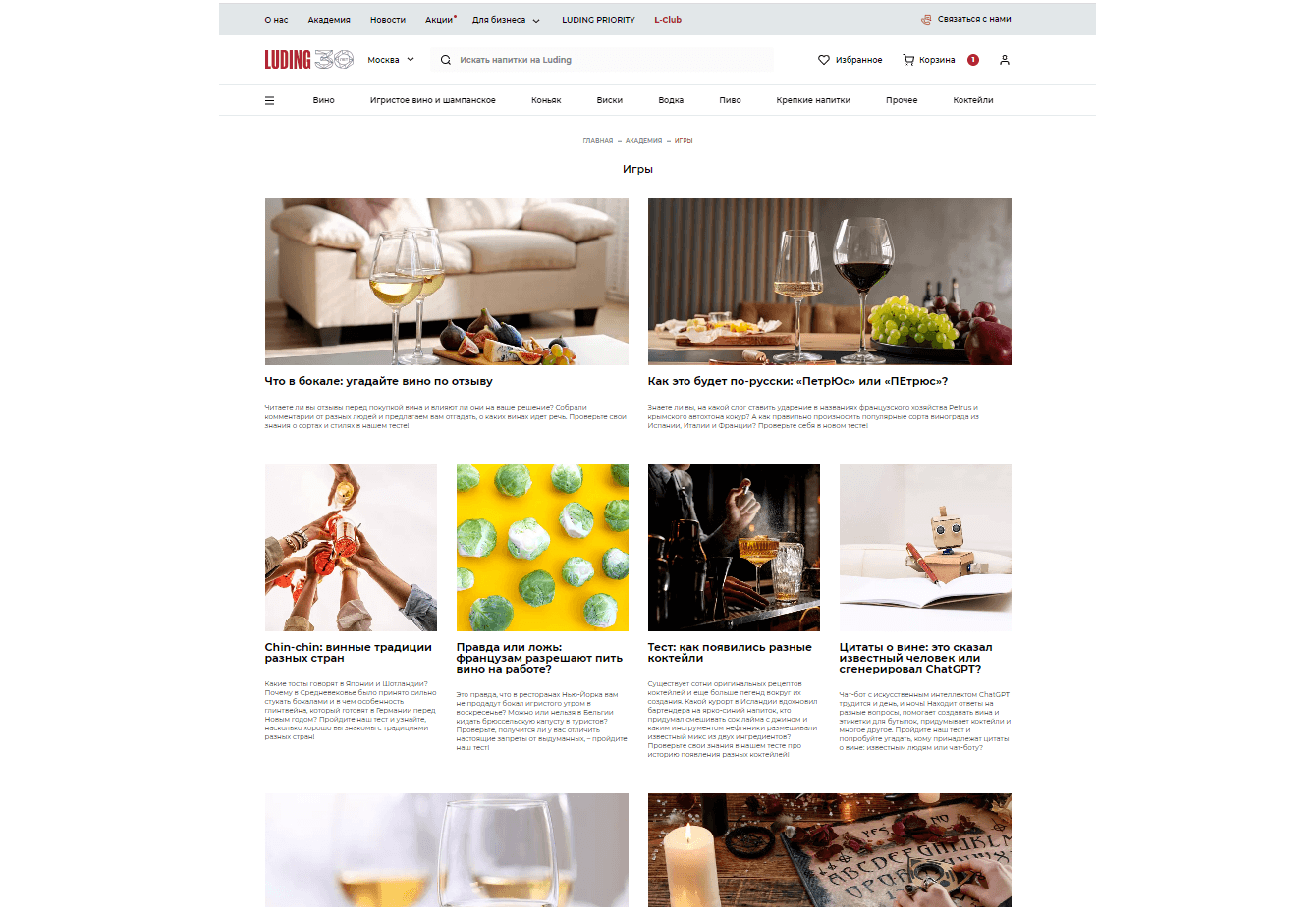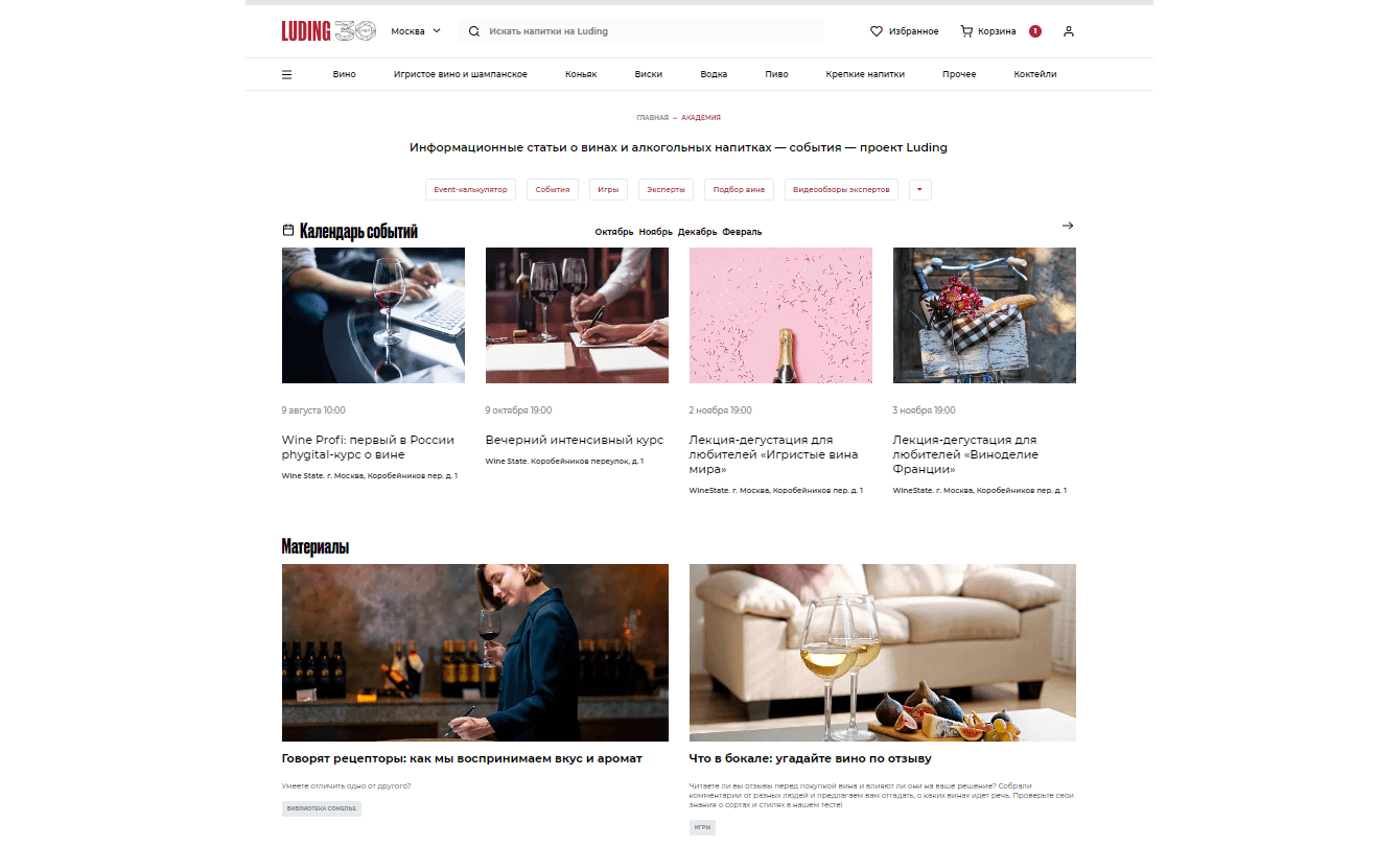 На сайте есть раздел «Академия» с анонсами событий — лекций, дегустаций, обучающих курсов, с информационными статьями о винах и алкогольных напитках. Клиент сам пишет такие статьи по нашим ТЗ. Это информация экспертного уровня от сомелье компании. Над информационными текстами мы работаем по алгоритму: