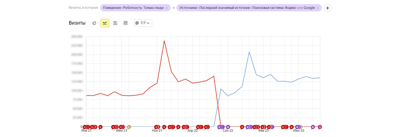 На этом графике видно изменение посещаемости карточек товаров. Красный график — трафик l-wine.ru, голубой — luding.ru.