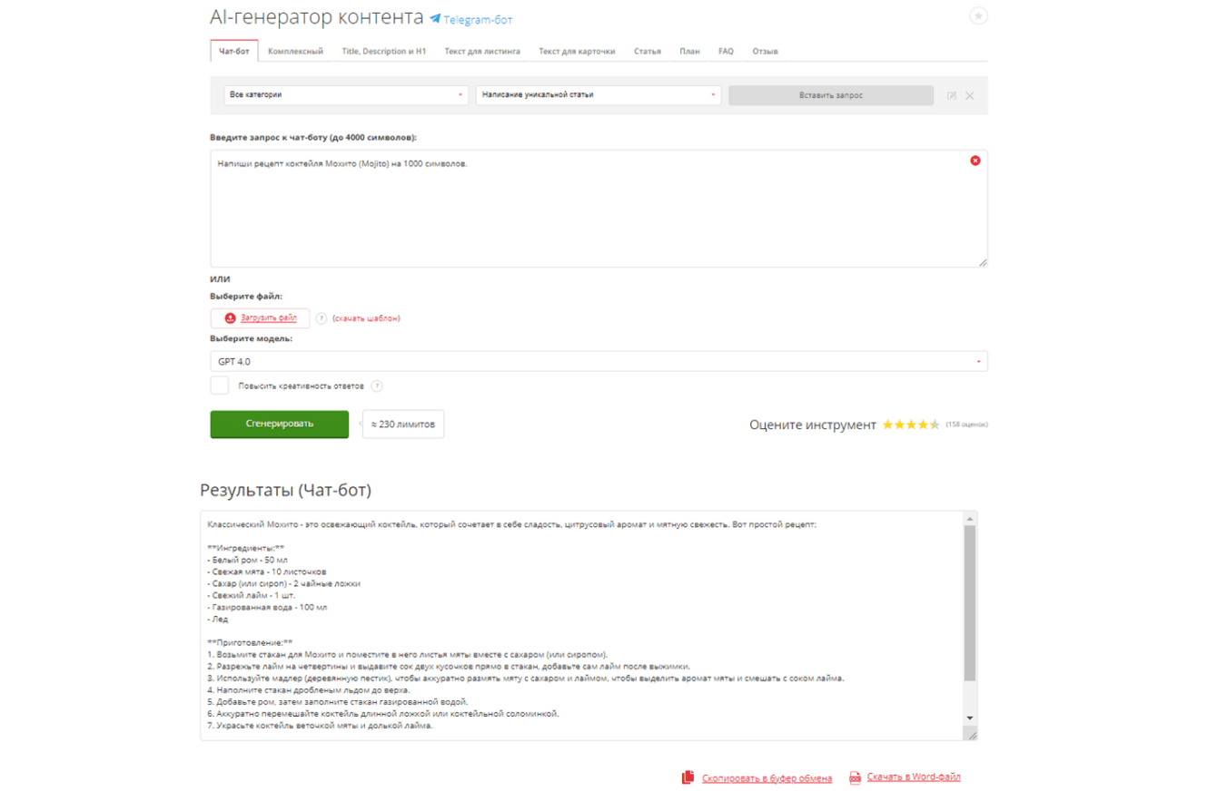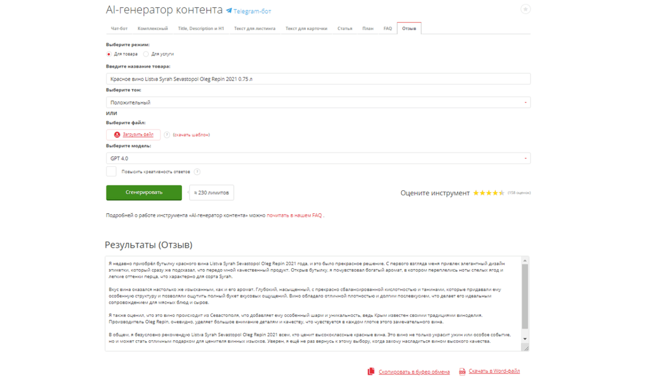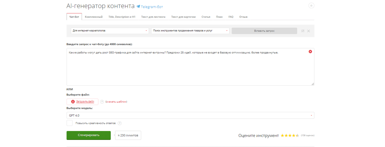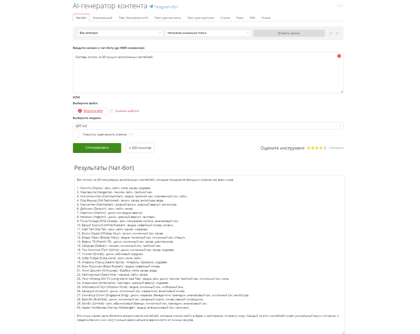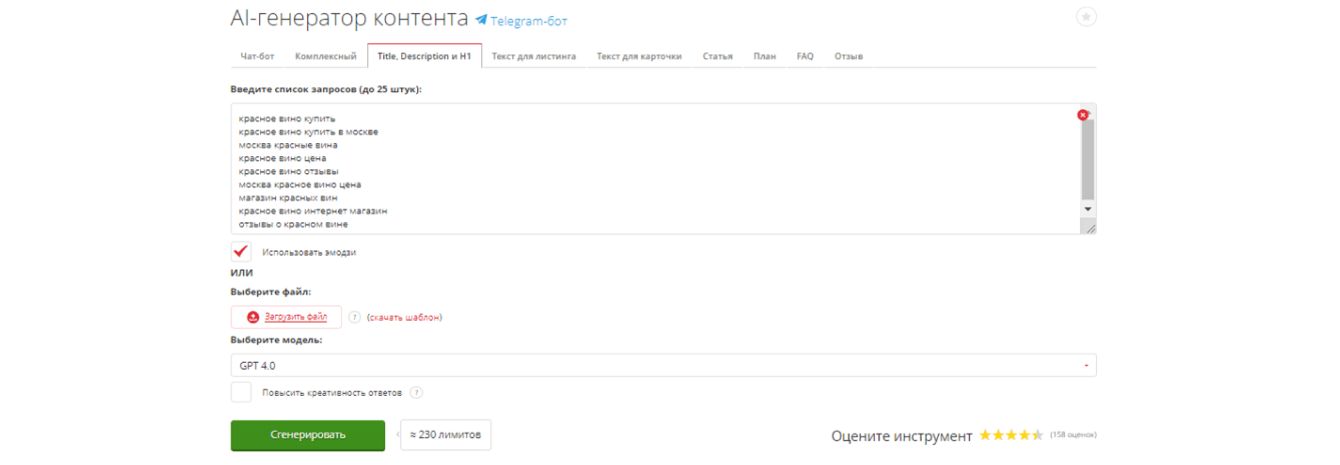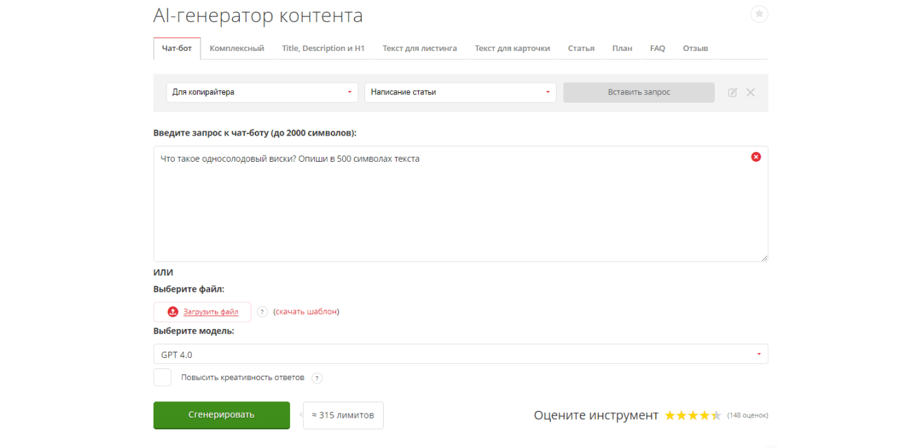 Для экспериментов мы использовали наш инструмент «AI-генератор контента» https://tools.pixelplus.ru/tools/ai-content, который работает на базе нейросети ChatGPT 3,5 и 4.